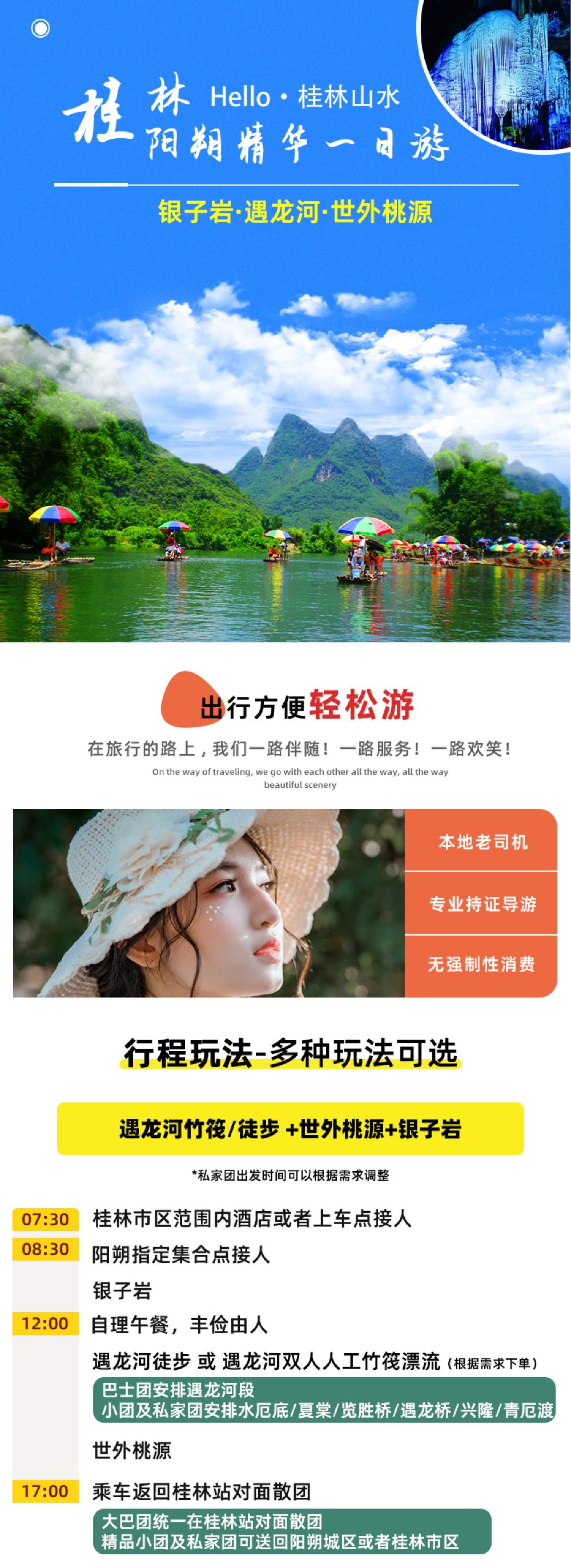 (双人竹筏:巴士团遇龙河安排遇龙桥至犀牛塘往返段;精品小团及私家团遇龙河安排水厄底工农桥段/夏棠骥马段/青厄渡阳朔湾段/览胜桥骆驼过江段/遇龙桥西牛潭段/兴隆大石寨坝段,6选1,会根据当天景区人流情况选择漂流段落,可体验冲坝,乘竹筏约40分钟)