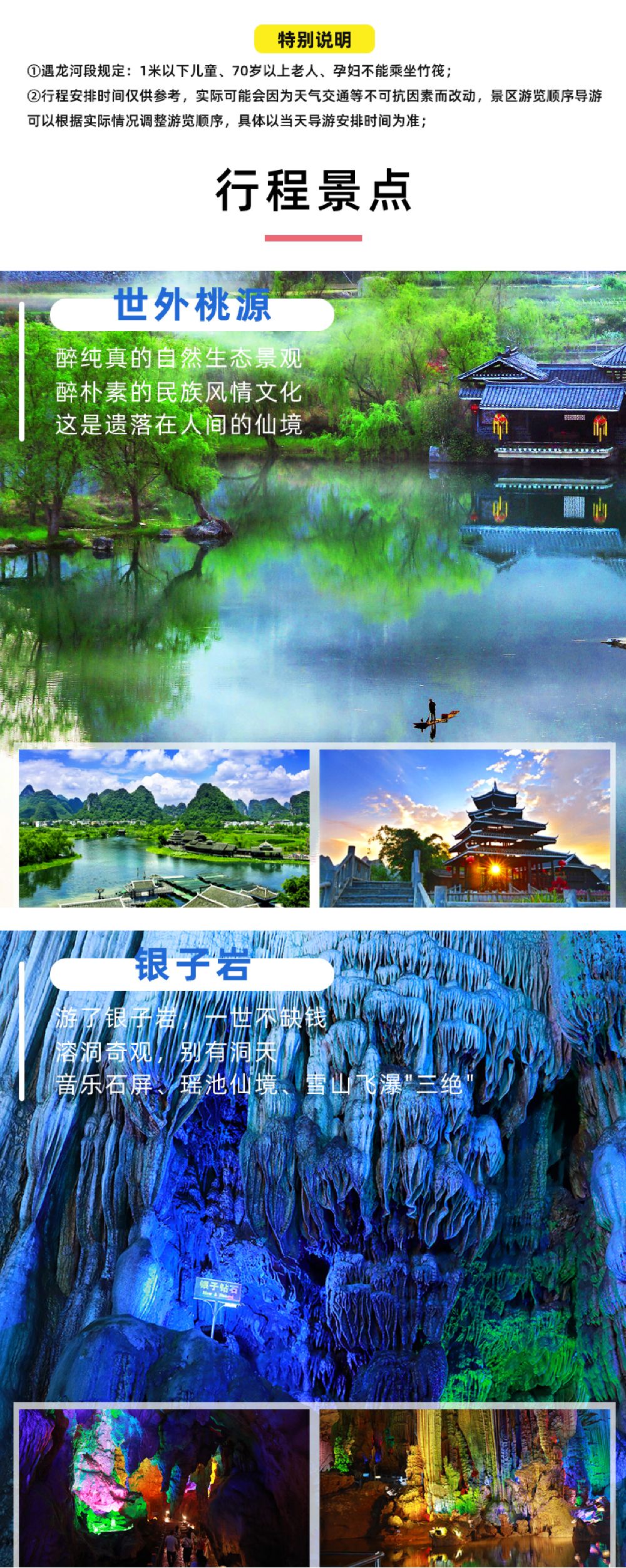 7、如遇节假日【特别是春节、五一、国庆黄金周】遇龙河码头会根据当天景区人流情况选择漂流段落(水厄底工农桥段/夏棠骥马段/青厄渡阳朔湾段/览胜桥骆驼过江段/遇龙桥西牛潭段/兴隆大石寨坝段,6选1,请以导游当天实际安排为准),竹筏排队时间过长或者临时停票,可更换为其他等价景点或退差价改为徒步观光。