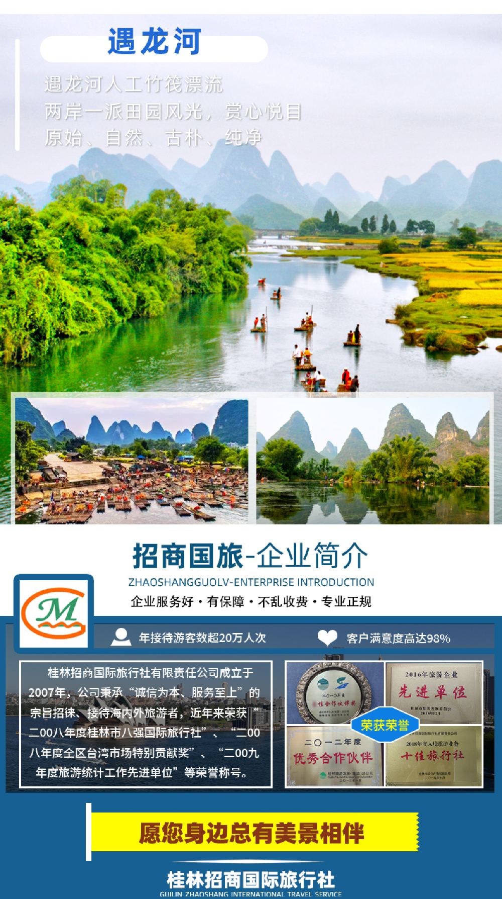 3、遇龙河景区规定1米以下儿童、70岁以上老人、孕妇不能乘坐双人竹筏,如有此类人群请可改为自由徒步遇龙河,我们将退差价给您。
