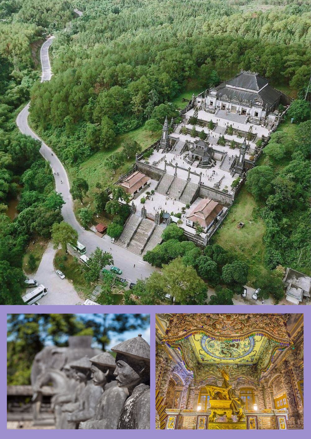 11:00-11:45: 来到顺化游客将参观坐落在 Chau E 周饿山峰上的Khai Dinh Tomb 启定皇陵。这里有高级的楼梯系统和众多具有古代风格的建筑,如Bi Dinh 院、 Loi Phong 雷锋宝塔、 文武官崇拜院。这里的建筑包括不仅亚洲与欧洲还有古代与现代的设计风格组成。进入启城殿的正殿,贵客将被这里的威仪和雄伟,美丽和惊艳的大正殿迫使十分吃惊。