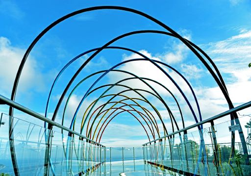 ▲ 亚龙湾热带天堂森林公园玻璃栈道悬空于山林间。走在其上,脚下透明玻璃清晰展现山林景色,周边绿树环绕。既体验高空刺激,又能360度欣赏雨林与亚龙湾海景,带来独特游玩感受。