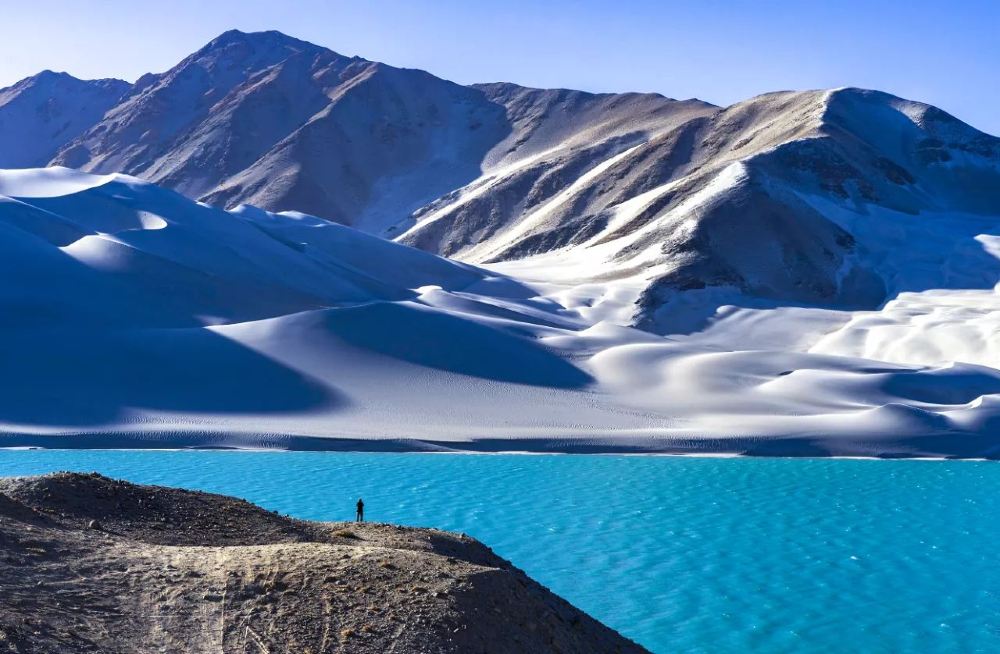 ▲ 一半是经年沉积的白沙,一半是纯净碧蓝的湖水,于时间的长叹中涂抹着帕米尔高原。 从喀什出发沿途G314国道向西行。走过一路荒芜,抬眼便是白沙湖,冰川,湖泊共绘的美景。