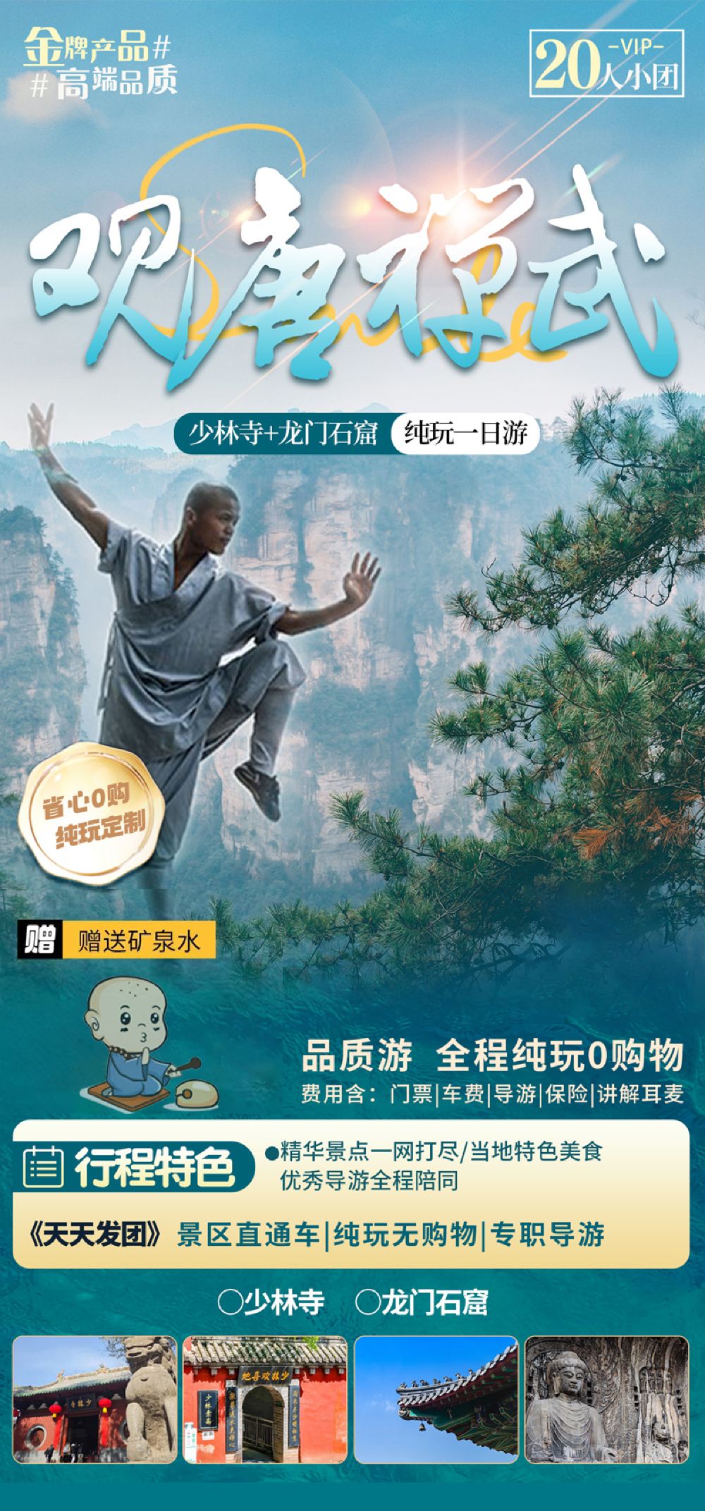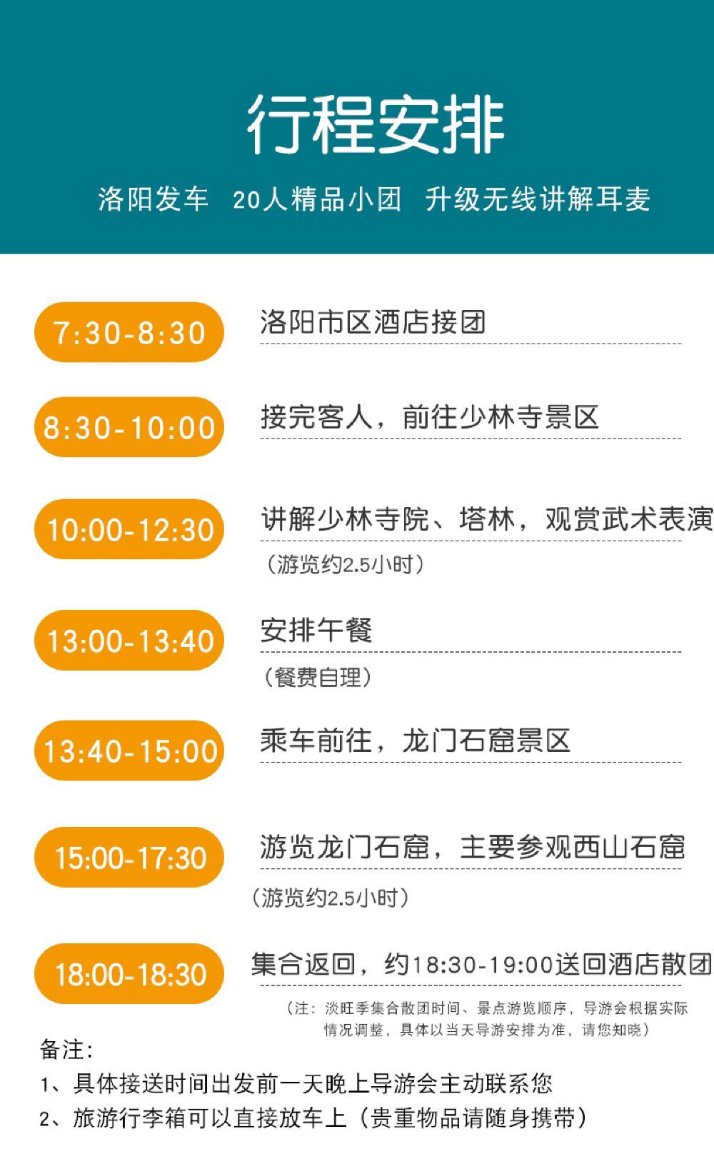 【20人小团】洛阳出发嵩山少林寺龙门石窟跟团一日游市区酒店接【【导游讲解】导游陪同讲解少林寺寺院,龙门石窟,配发耳麦,听导游讲解更清楚,让您不虚此行】