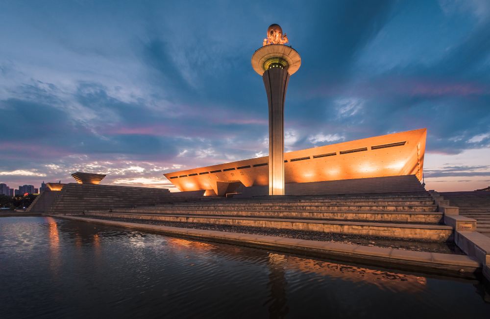 ▲ 洛阳博物馆外观大气恢宏,独特的建筑设计融合了历史与现代元素。在傍晚的光影中,馆体被暖黄灯光照亮,与周围的水景相映成趣,宛如一座时空桥梁,连接着洛阳深厚的历史底蕴与蓬勃的现代生机,彰显着十三朝古都的文化魅力。