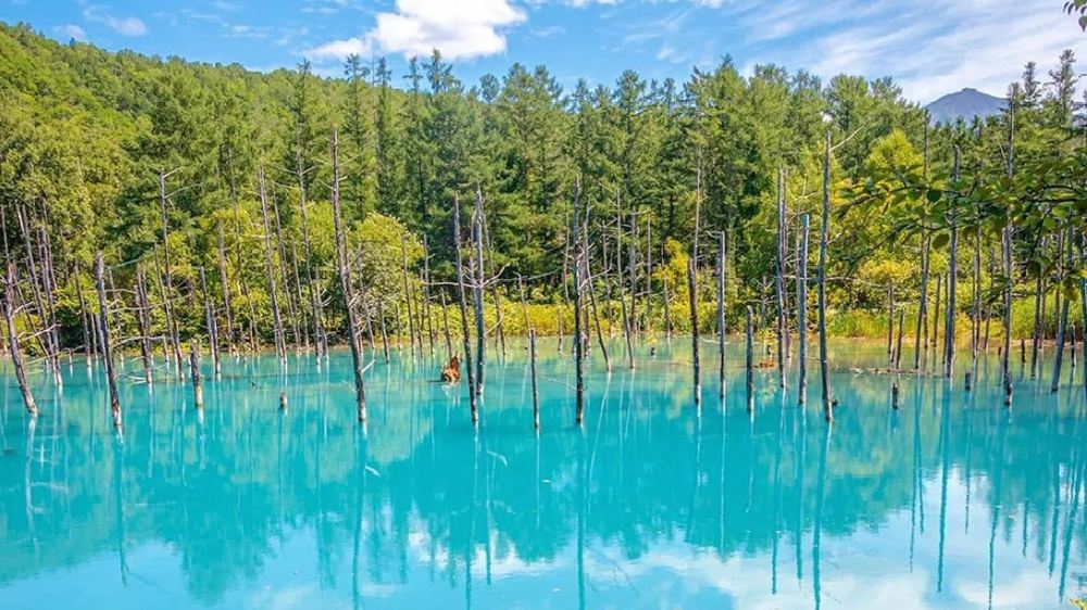 ▲ 白金青池, 因池水中富含矿物质,使得水面呈现柔和的蓝绿色调, 一棵棵树干静静立在水中, 倒映着天空与云影,是北海道夏天很受欢迎的自然景点。 步道平缓,适合慢慢散步欣赏这份宁静。