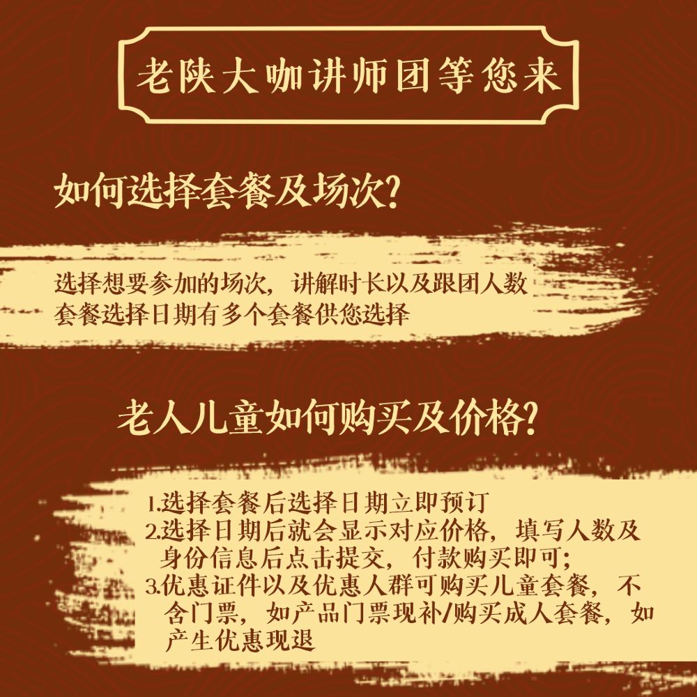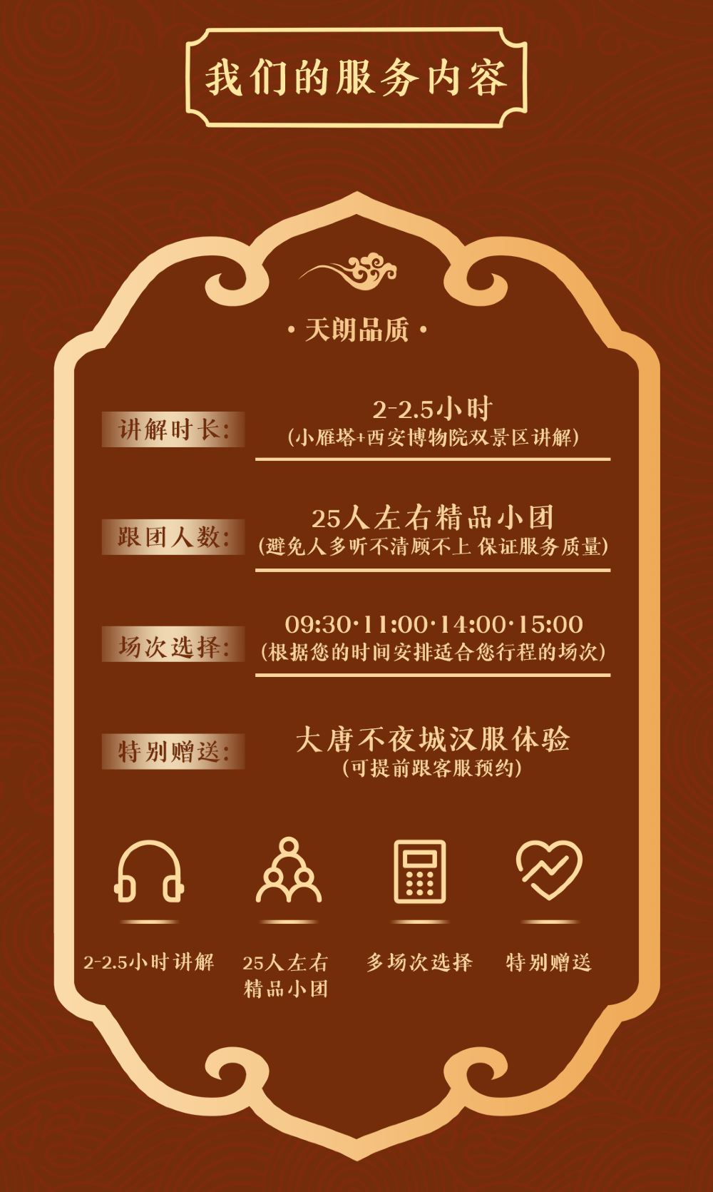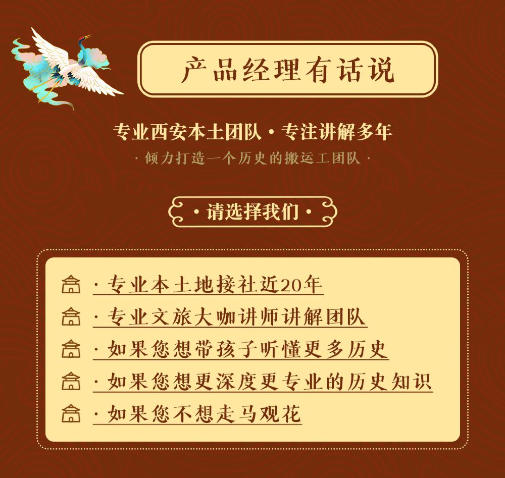 1、本产品不接不送(不含交通),需自行集合前往景区(介意勿拍),集合地点:西安博物院北门/西门,具体地点以提前一天通知为准;产品为一个门票多个景点(讲解为西安博物院+小雁塔两景点讲解);