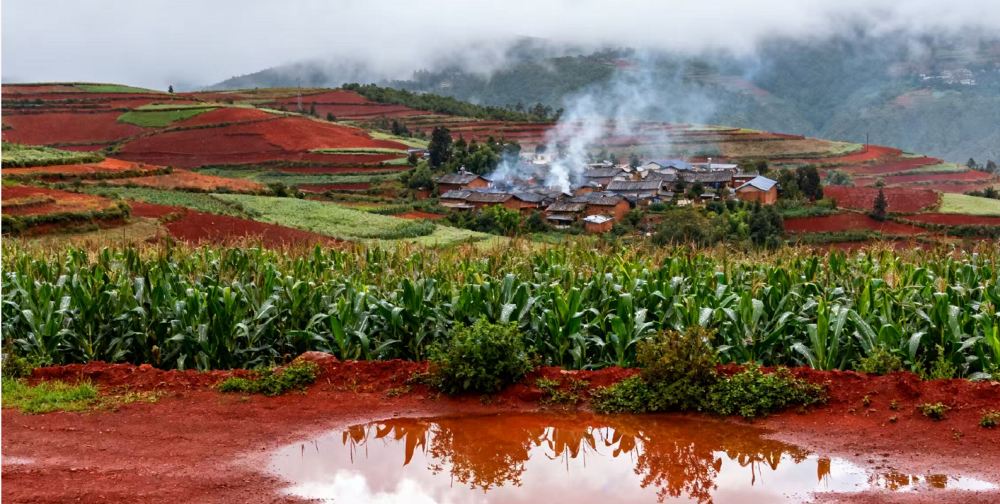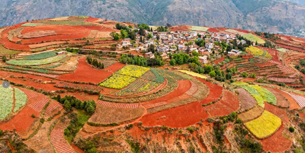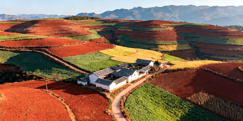 ▲ 这里因独特的高原气候与地质条件,土壤中含铁、铝成分较高,经长期风化形成鲜艳的赤红色,与田间错落的农作物、白色洋芋花、金色麦浪及绿色作物交织,构成色彩斑斓的田园画卷。核心景观区集中在花石头村、落霞沟、打马坎、锦绣园等区域,不同季节有不同韵味——春季作物新生显清新,夏季绿意盎然衬红土,秋季作物成熟呈金黄,冬季土地裸露更显红土本色,四季皆适合摄影创作。