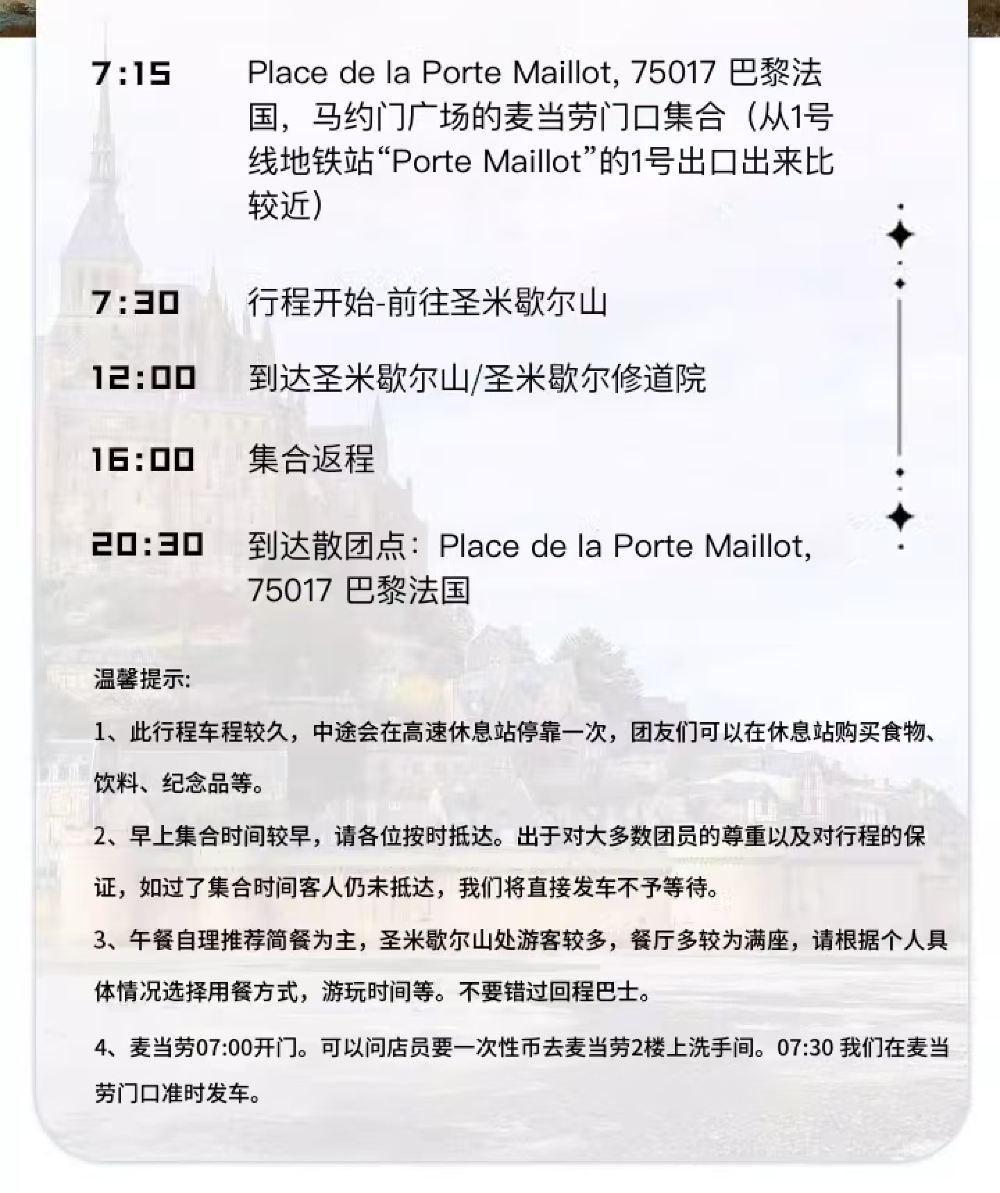 【中文团】法国巴黎往返丨圣米歇尔山一日游(赠送可口晚餐)【拒绝中英混拼,只做精品中文团,全年可定,优质中文导游,官方门票代订无忧。】