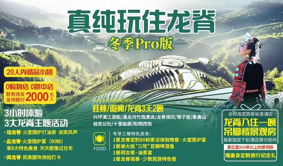 龙脊梯田+漓江三星游船+银子岩+兴坪古镇+遇龙河景区三日游【真纯玩小团|吃围炉宴|住800米龙脊景观房】