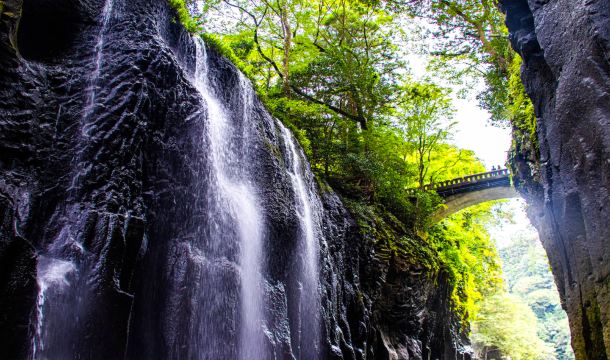 ▲ 【高千穗峡谷】 沿着清澈溪流漫行,峡谷两侧峭壁高耸,水流冲击石壁发出低沉而动听的声响。尤其在秋天格外迷人,峡谷两侧红叶似火,与碧绿溪水相映成趣,仿佛进入一幅动人的秋日画卷。