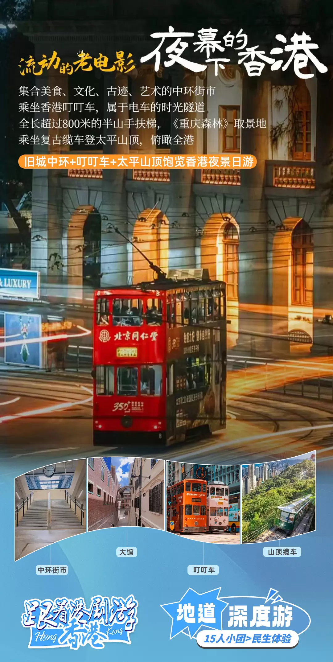 15人小团丨夜幕下的香港夜游半日丨不用早起,开启舒适旅行【乘叮叮车+缆车登太平山顶+半山手扶梯丨赠保险】