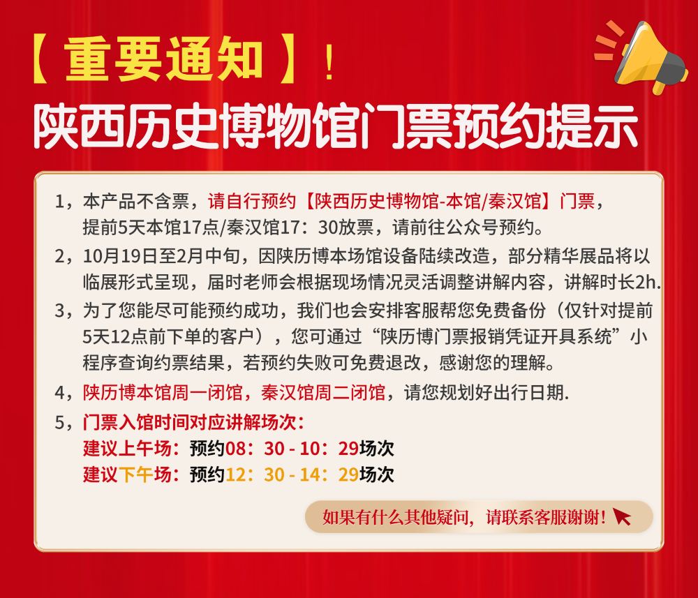 注意事项:陕历博本馆不含门票,下单前请在公众号上提前预约门票,提前5天下午5点放票,约票问题咨询客服。