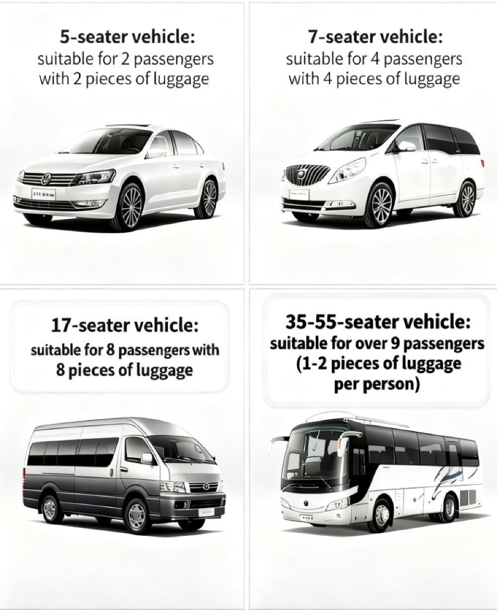 关于行李容量:我们的标准车辆可容纳每位乘客一件大件行李。如果您预计会有额外行李(例如,额外的行李箱、笨重物品或特殊设备),请提前联系我们。我们将乐意为您安排更符合您行李需求的车辆,但需收取升级车型的额外费用。