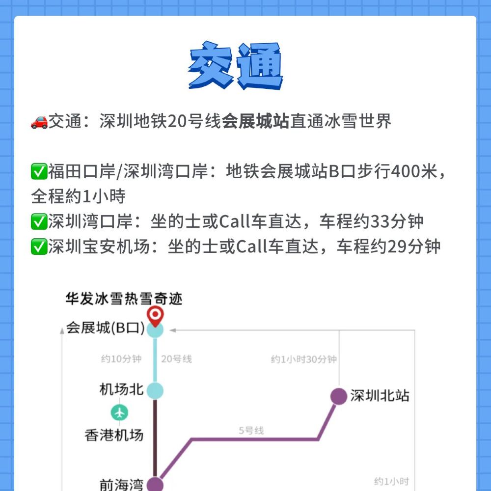 滑雪场坐落于深圳市宝安区沙井南环路,路网便捷易达。游客可搭乘深圳地铁12号线至“海上田园南站”或20号线至“会展城站”,出站后步行10分钟内即可抵达。