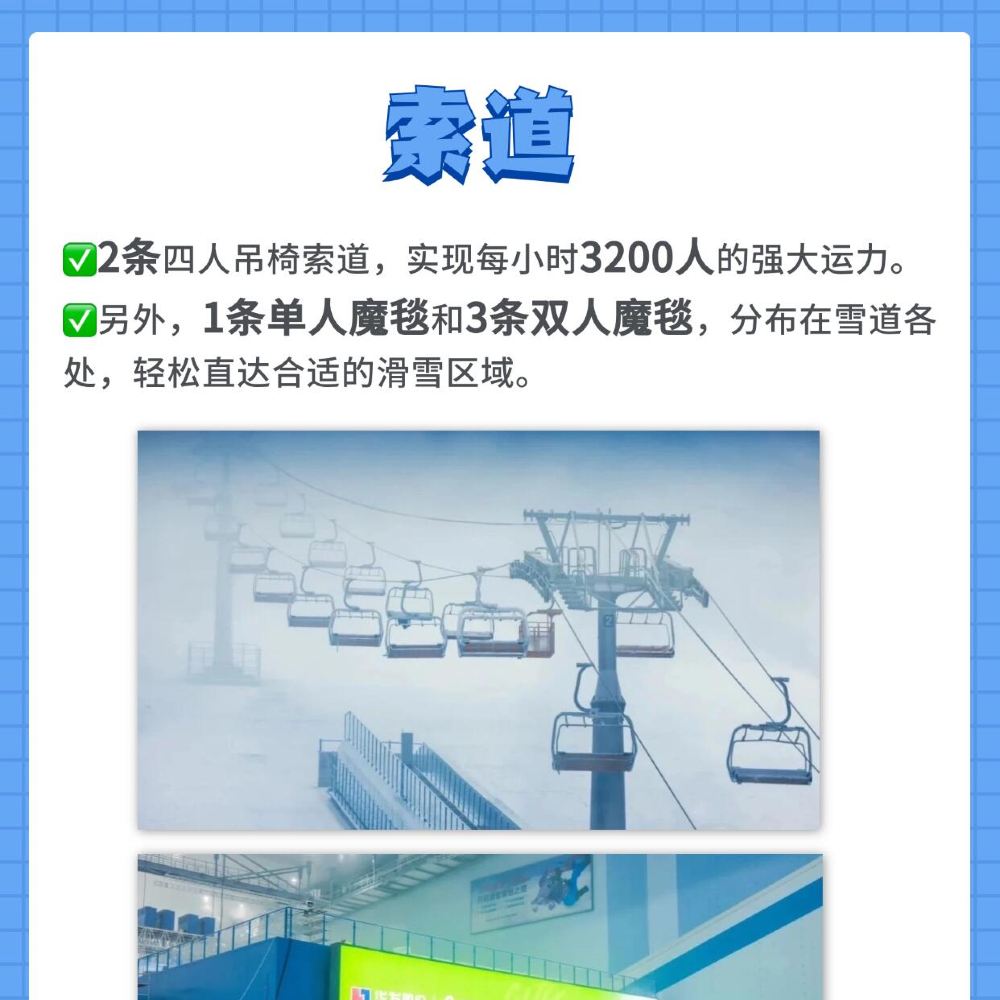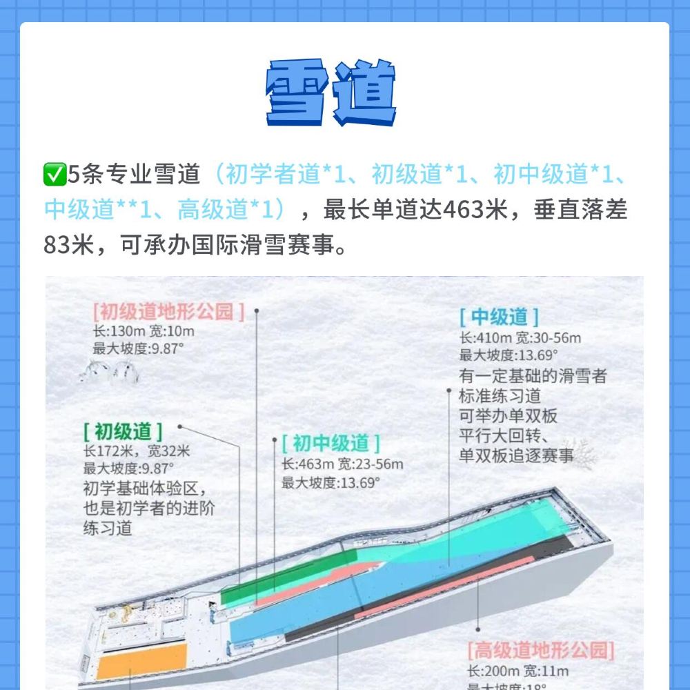 3.场内设有初级道、中级道、高级道等不同难度的雪道,初学者进入中、高级雪道滑行容易发生运动损伤:同时场内设有跳台、地形公园区域,进入该等区域游玩需您具备较高的滑雪技巧:请根据自身滑雪水平谨慎选择游玩,游玩时请务必控制在自己的滑雪水平范围内,注意滑行安全。