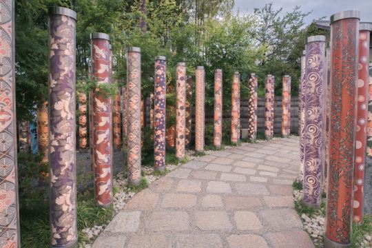 数百根透明圆柱林立如森,每一根中都悬挂着一件华美和服,色彩流转、纹样生辉。