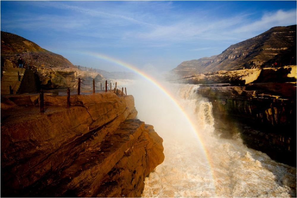壶口瀑布是中国第二大瀑布,世界上的黄色瀑布 。黄河奔流至此,两岸石壁峭立,河口收束狭如壶口,故名壶口瀑布。瀑布上游黄河水面宽300米,在不到500米长距离内,被压缩到20—30米的宽度。1000立方米/秒的河水,从20多米高的陡崖上倾注而泻,形成“千里黄河一壶收”的气概。