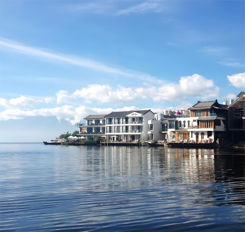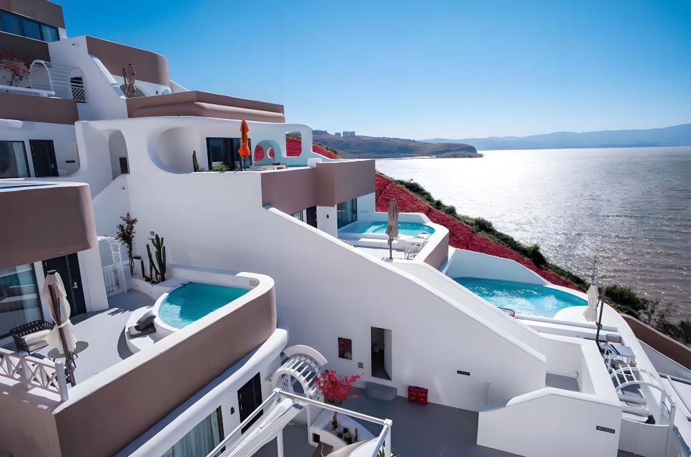 理想国旅游度假村(大理的圣托里尼岛):蓝白相间的建筑群,让人联想到希腊的圣托里尼岛,拥有俯瞰洱海的无边际泳池,散发着**的度假氛围。