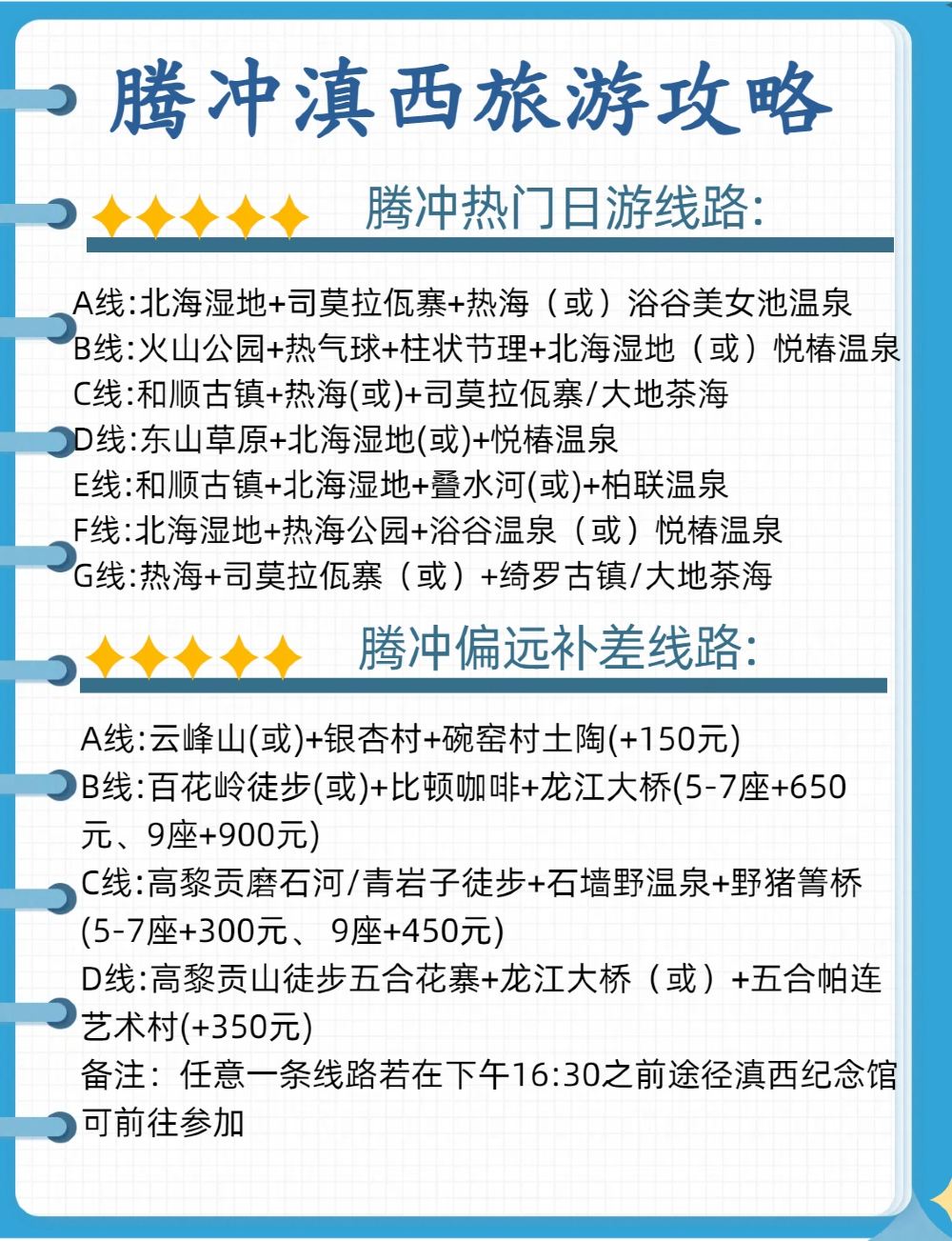 热海公园、大滚锅、北海湿地、火山公园、柱状节理北海湿地、和顺古镇、大地茶海、司莫拉瓦寨、东山草原、叠水河瀑布、滇西纪念馆(悦椿、柏联、洞山、永乐、大董温泉)、梦幻腾冲演出、来凤山森林公园、绮罗古镇、龙川江漂流(根据天数选择性游玩)季节性景点:银杏村:在10月中至12月中。界头油菜花海:在2月至3月份期间游玩。