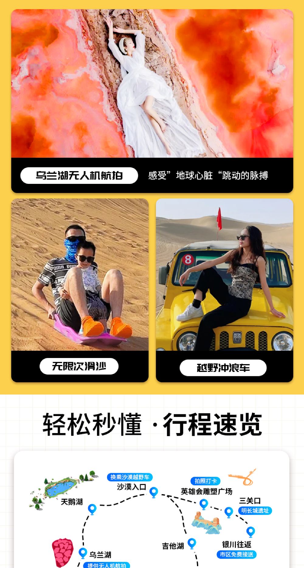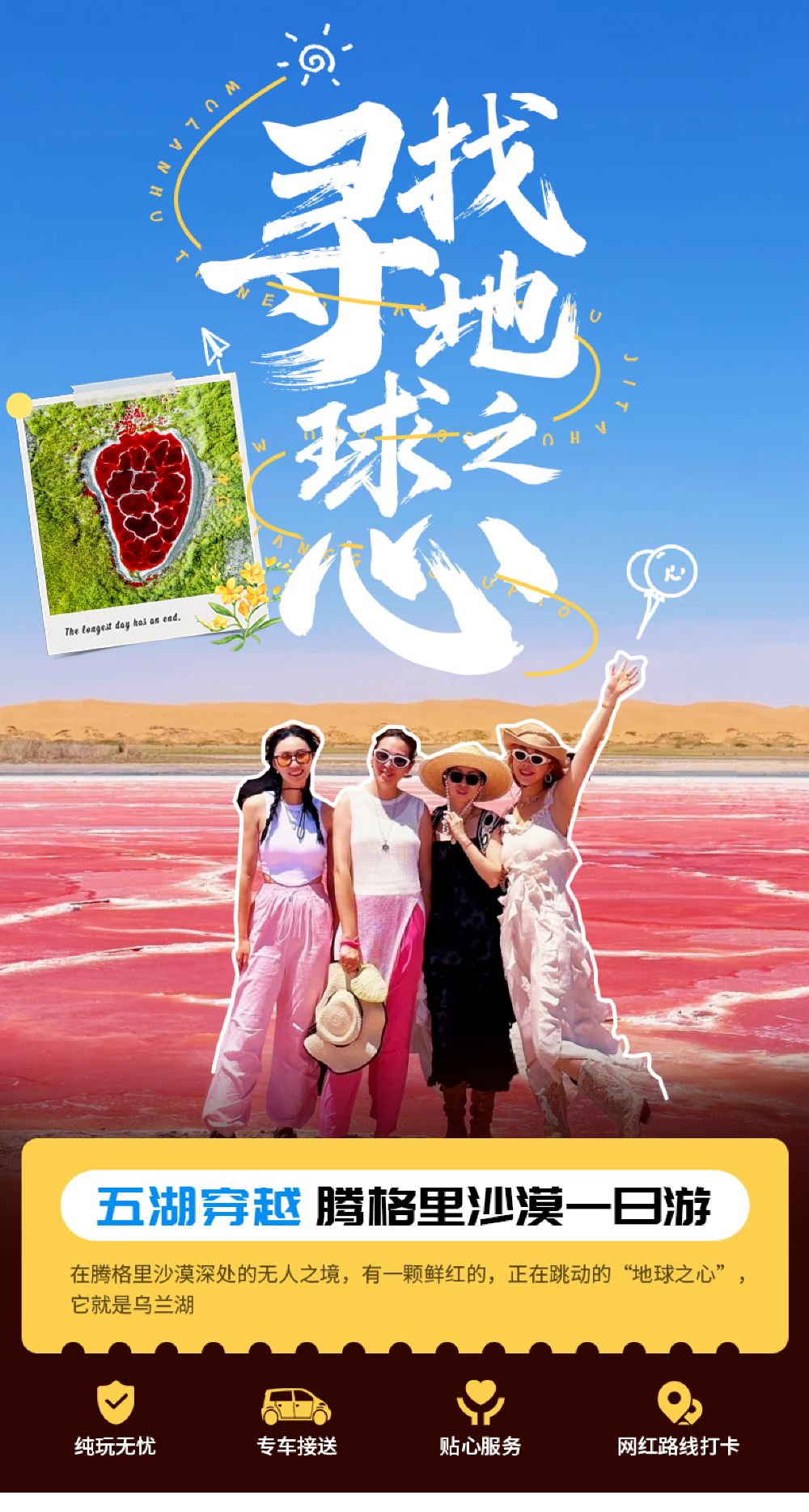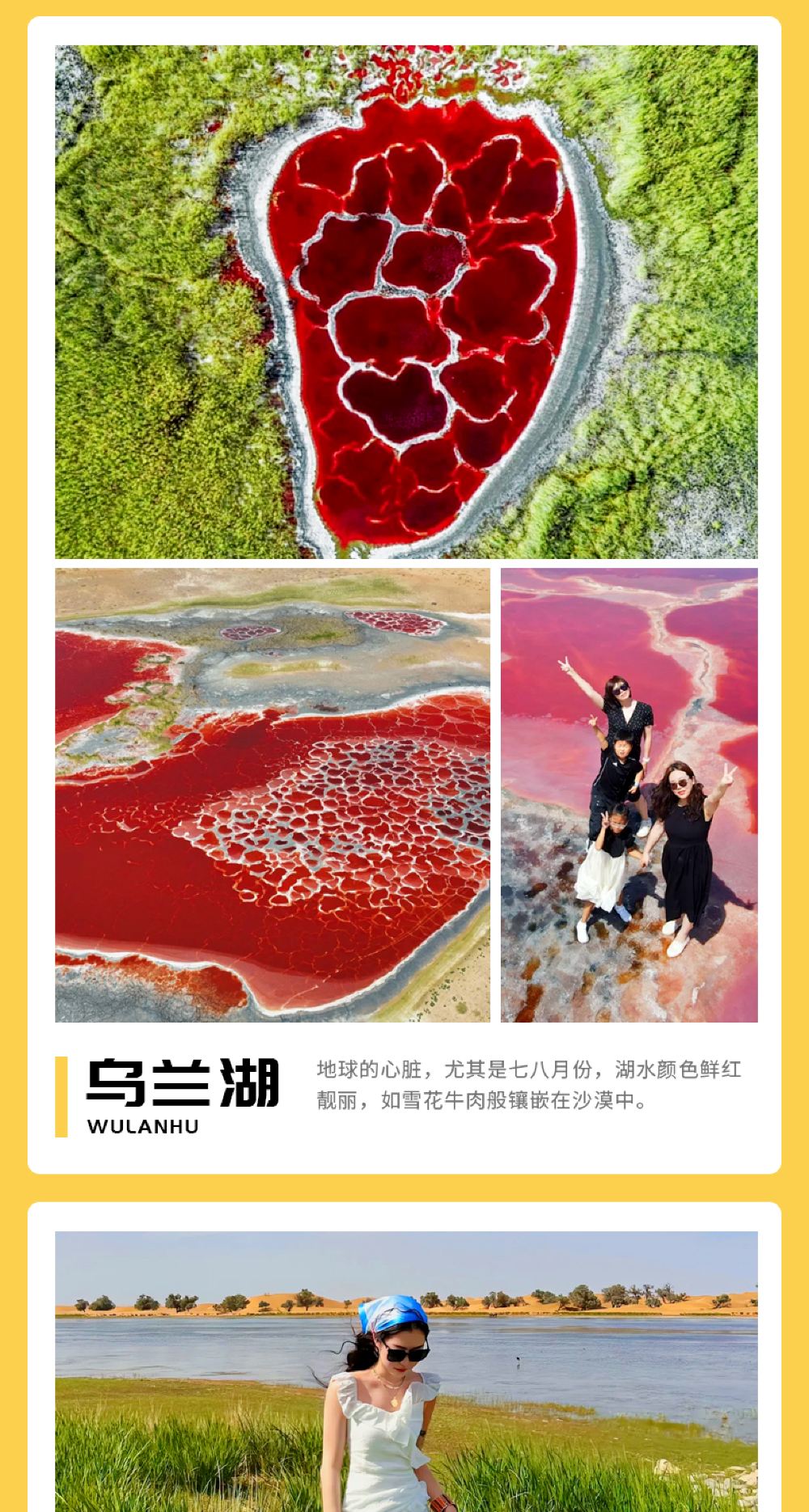 【五湖穿越专线游】腾格里沙漠+乌兰湖·赠航拍+滑沙+越野冲沙【[五湖穿越]网红路线深度游玩打卡乌兰湖‘地球的心脏’、骆驼湖‘粉红之境’、天鹅湖‘大漠秘境’吉他湖;】