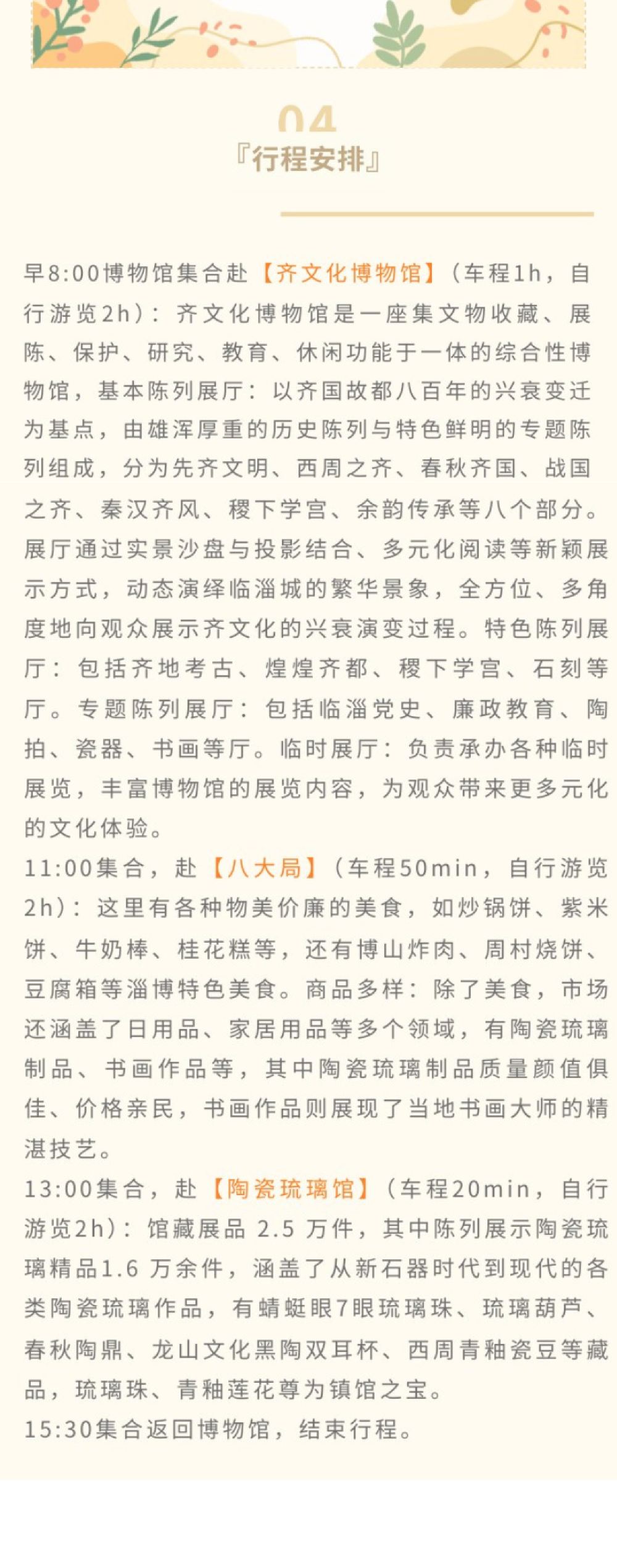 来淄博,别错过这条人文烟火兼具的路线!上午一头扎进齐文化博物馆,青铜器、竹简诉说着千年故事,带你领略齐国辉煌。中午到八大局,炒锅饼的香、紫米糕的甜,还有数不清的特色小吃,满满都是生活的热辣。下午踏入陶瓷琉璃馆,流光溢彩的琉璃、古朴典雅的陶瓷,让人感叹传统工艺的魅力。一天玩下来,文化与美食兼得,超满足!