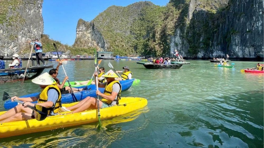 ▲ 在碧绿的海水中泛舟,四周环绕着巍峨的悬崖峭壁——这是探索下龙湾**沉浸感的方式之一。