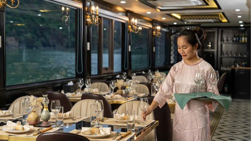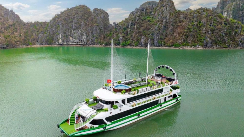 ▲ 一艘现代化的白绿相间的游轮优雅地滑过碧绿的下龙湾,周围环绕着雄伟的石灰岩喀斯特地貌。