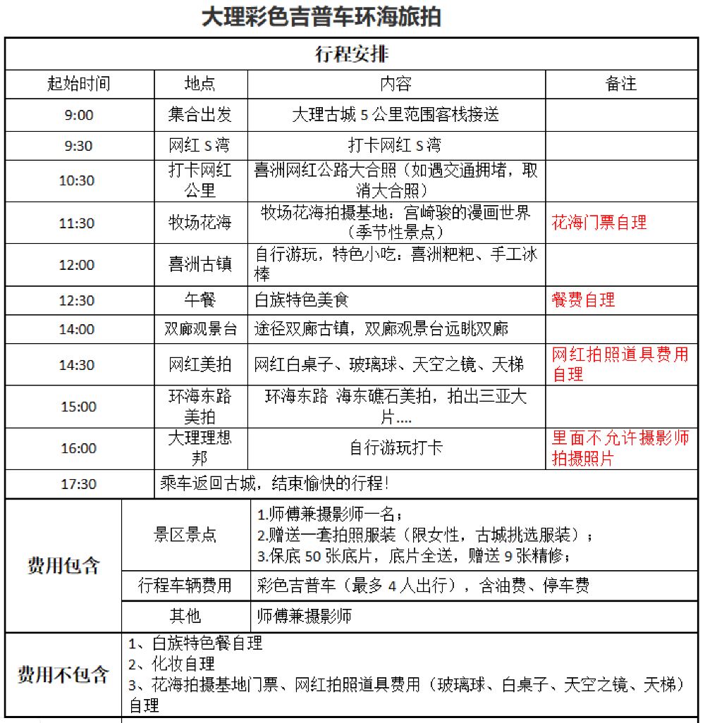 1、出行时间09:00-18:00,边玩边拍,如果拍照时间太多,到下午5点半没有走完的行程自行放弃,领队会和客人协商着走行程。