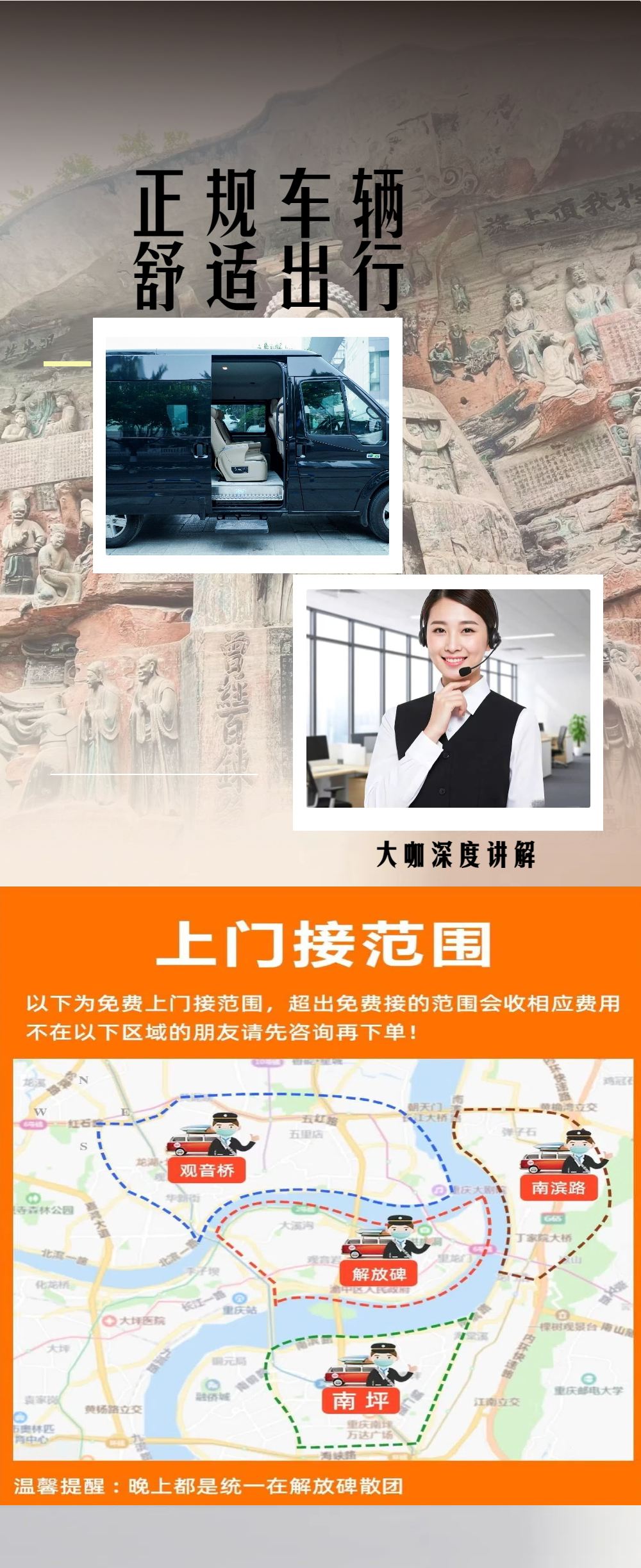 渝中区、南坪、弹子石、南滨路、重庆北站、观音桥、沙滨路、杨家坪、磁器口附近等2人及以上都可以上门接,返程统一在解放碑附近散团,如果超出范围请咨询客服。