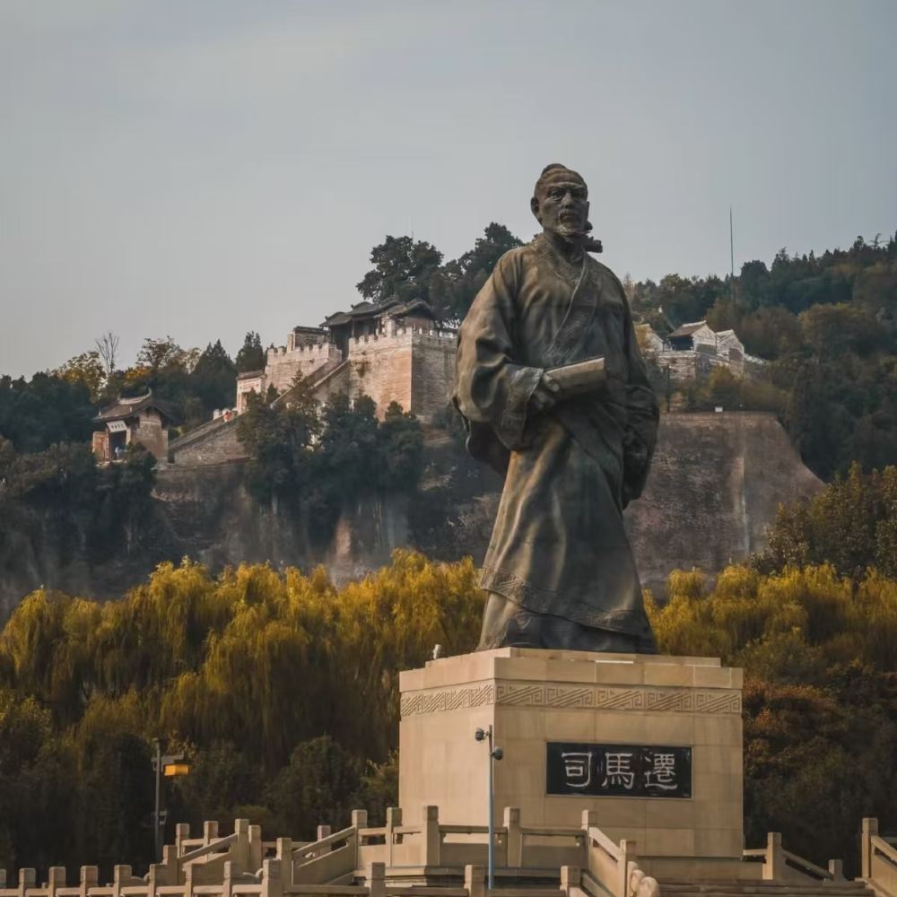 ▲ 拜祭史圣司马迁。司马迁祠墓始建于公元 310 年,距今己有 1600 多年的历史。整个祠庙高耸在龙亭塬上,东瞰黄河滩,西枕梁山,北为立壁,南临深壑,下有古车马道,凭高远望,气势宏伟。景区内有司马古道、祭祀祠堂、司马迁墓、各类展殿等景观,景区前为恢弘的司马迁祭祀广场,每年清明都会在此举行大型民间祭祀活动,提醒后人勿忘祖先遗德,风追史圣司马。