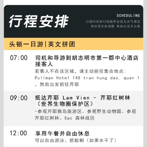 想逃离胡志明市,开启精彩的度假之旅?那就来参加我们精彩的芹苴岛一日游吧!芹苴岛位于城外,是宁静的自然胜地。您可以参观猴岛,喂食顽皮的猴子,与它们合影留念,甚至有猴子会跳到您的肩膀上!之后,您可以参观自越战以来就受到保护的鳄鱼,并体验一次可选的鳄鱼捕捞体验。搭乘快艇穿越茂密的红树林,前往「萨克」游击队基地,探索这个被联合国教科文组织列为重要生物圈保护区的历史遗迹。在充满探险的上午之后,您可以漫步当地海鲜市场,并享用美味的当地午餐。在返回之前,您可以在附近的游泳池放松身心,沐浴在阳光,为您的芹苴之旅画上完美的句号。