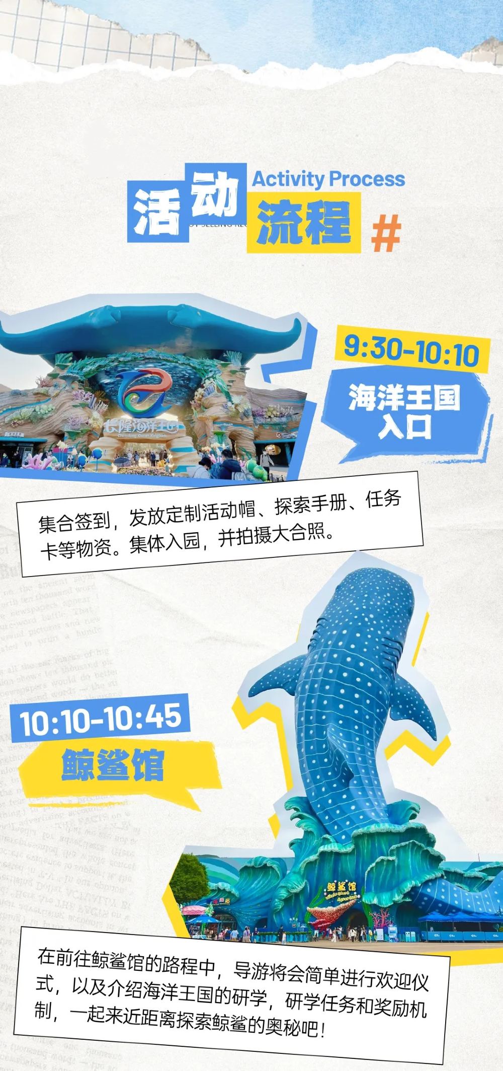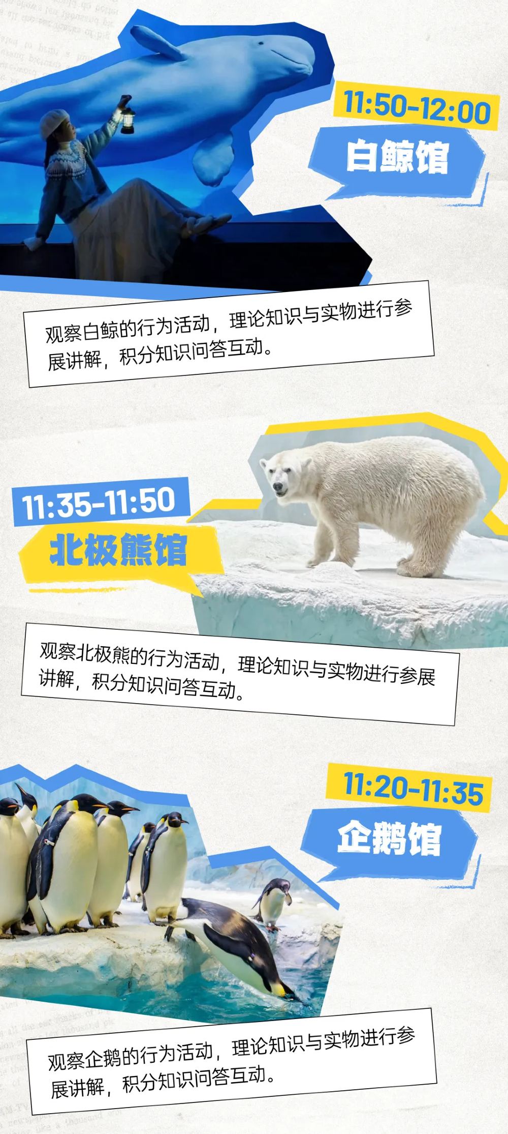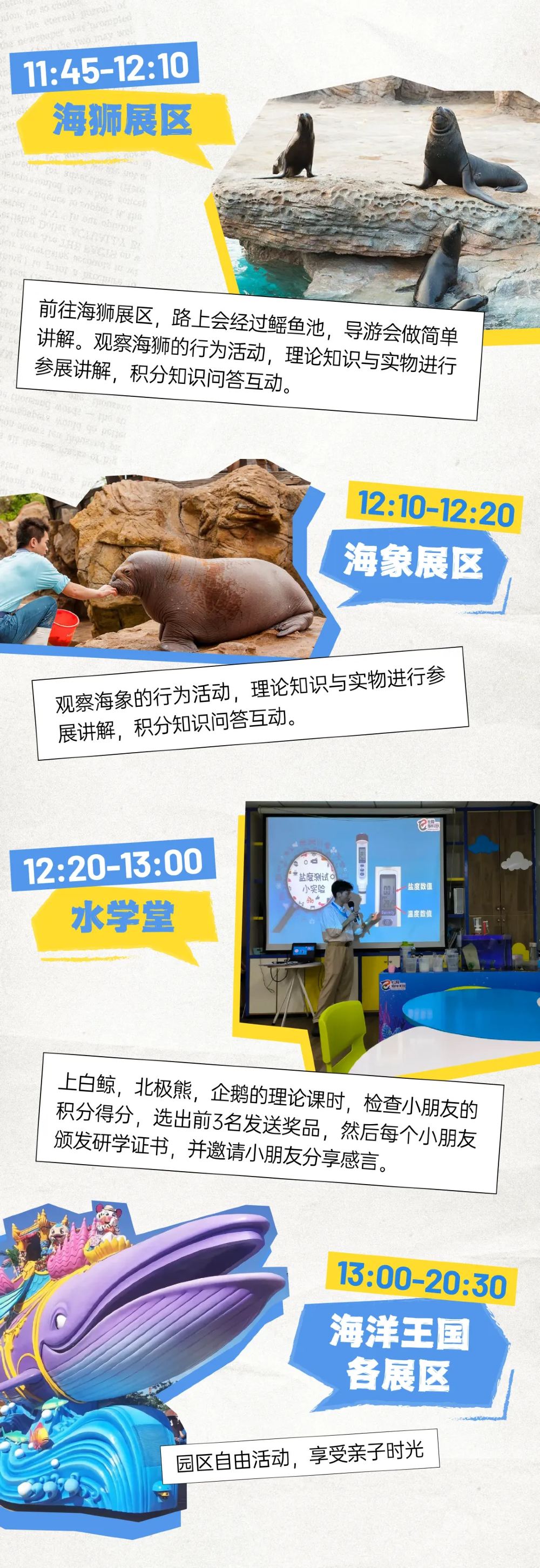 具体活动区域覆盖园区核心科教场馆,包括水学堂、企鹅馆、北极熊馆、白鲸馆、鲸鲨馆等