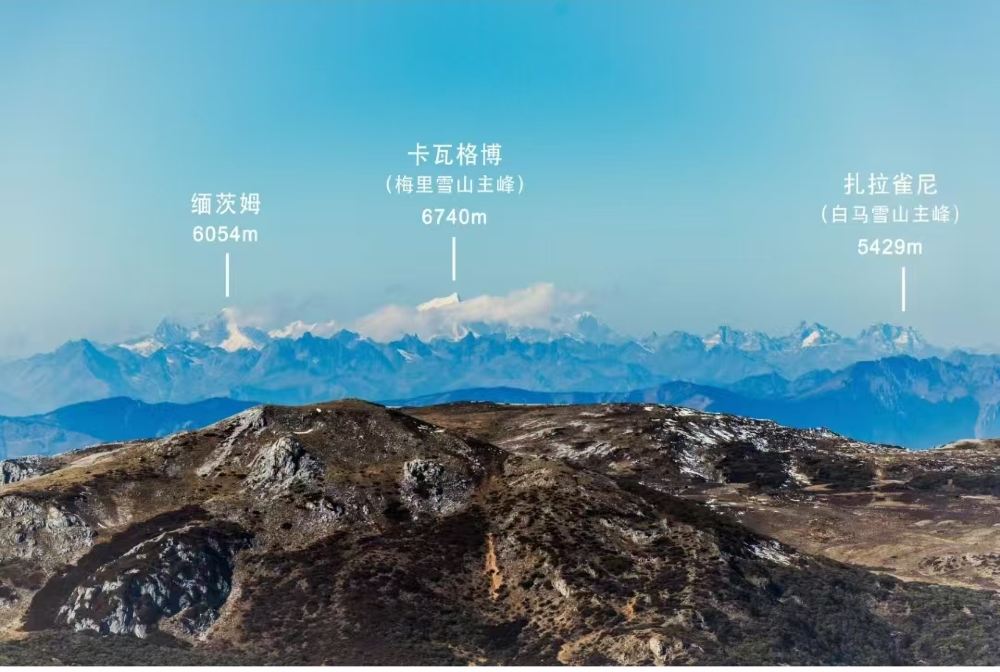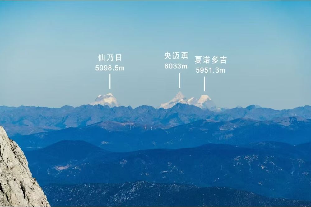 ▲ 在山顶上可以远眺 :梅里雪山 孔雀山 稻城亚丁三神山,哈巴雪山/玉龙雪山/