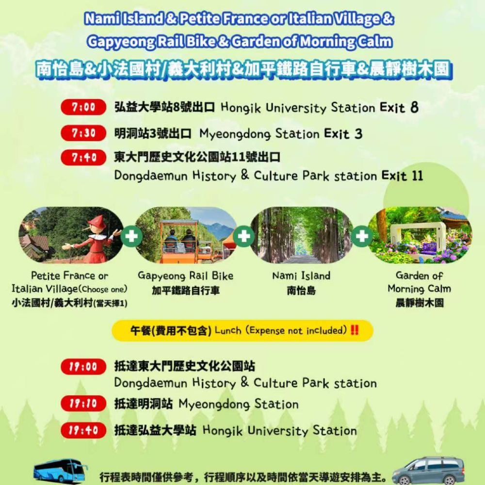 南怡岛+小法国或义大利村+加平铁轨自行车+早晨宁静花园一日游【南怡岛: 韩剧《冬季恋歌》取景地,四季皆美,有银杏大道、骑行小路与湖边美景,浪漫又放松。】