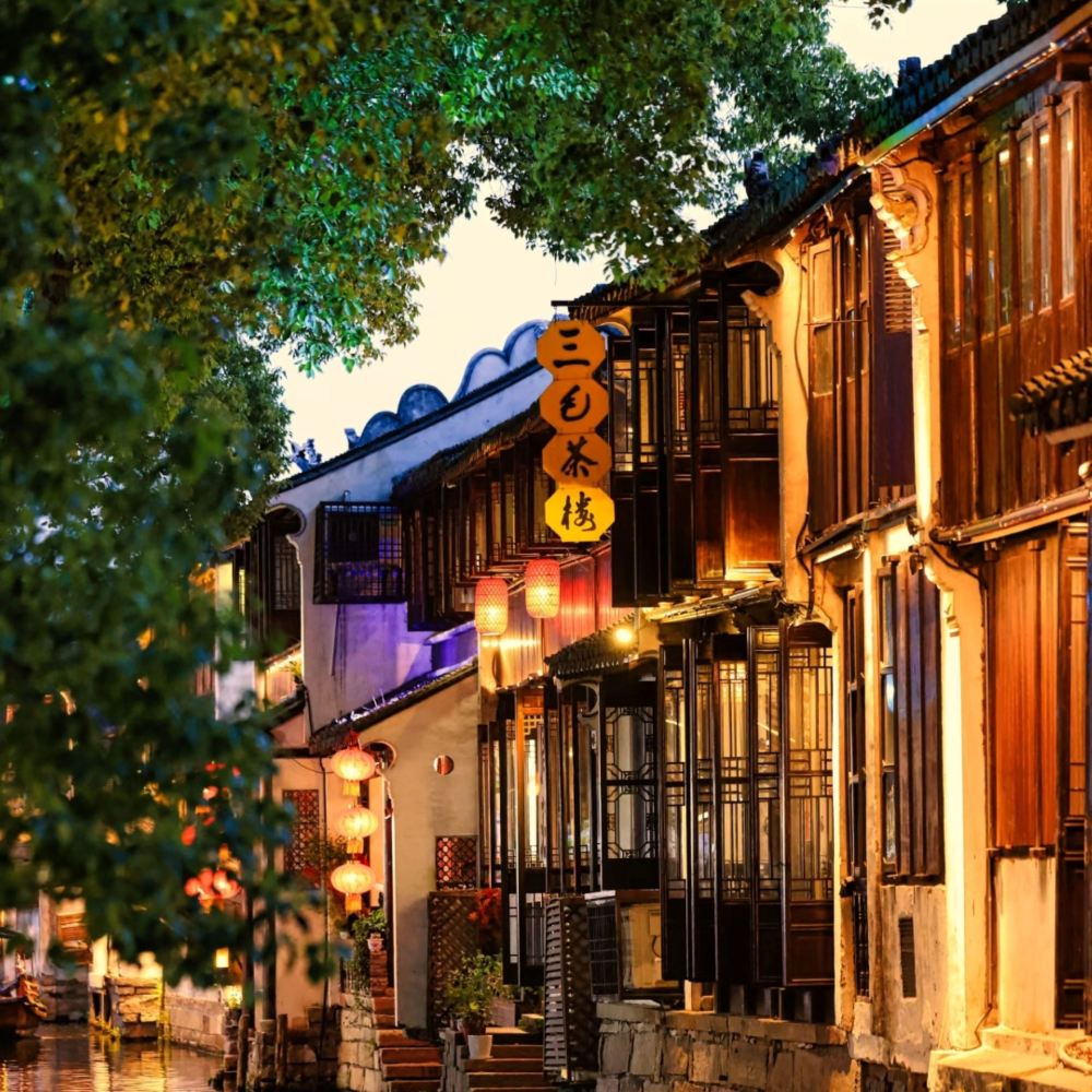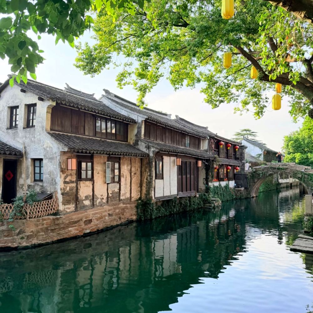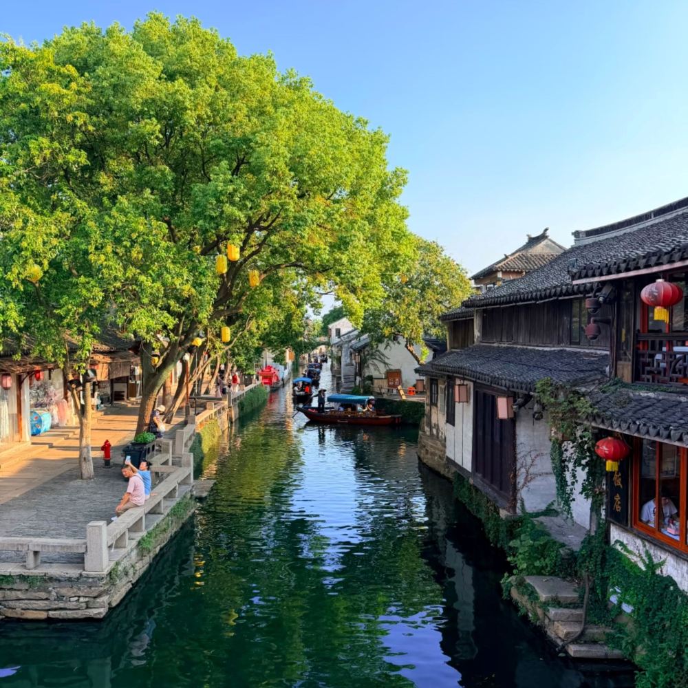 ▲ 周庄日间水乡风貌,河道清澈,乌篷船悠悠穿行,两岸黛瓦白墙的民居错落,绿树垂荫,黄灯笼点缀其间,游人或闲坐岸边,尽显江南古镇的宁静与烟火气