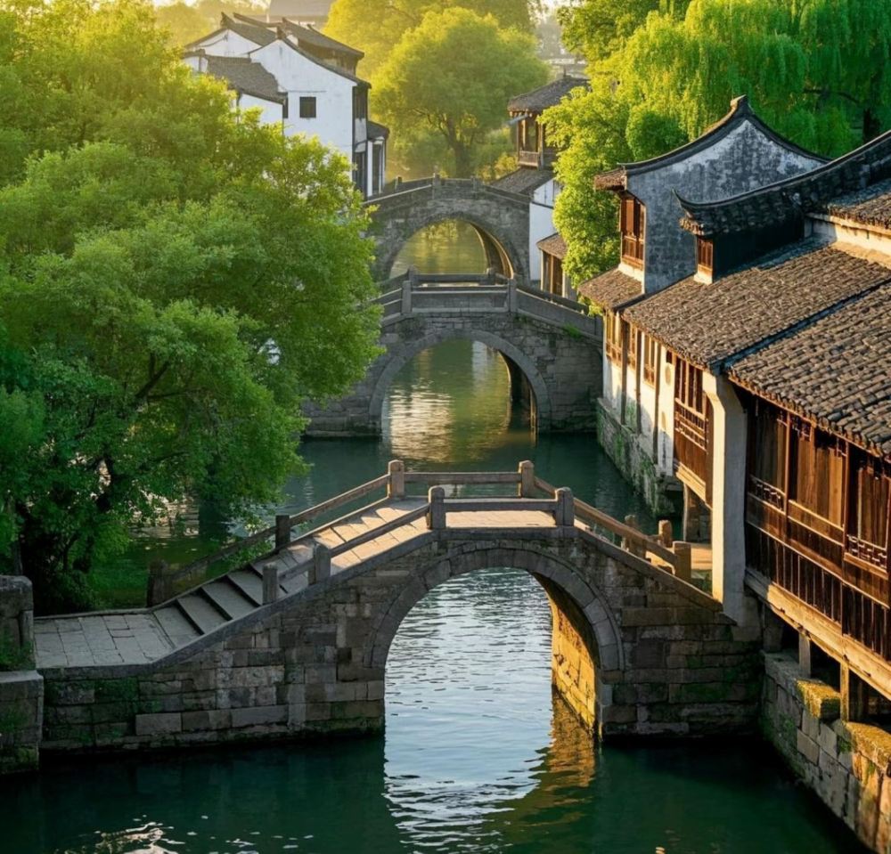 ▲ 多座石拱桥在河道上层层叠叠,古朴的石桥与白墙黑瓦的民居、葱郁的绿树相映成趣,晨光洒下时,河水、建筑、桥影构成层次丰富的画面