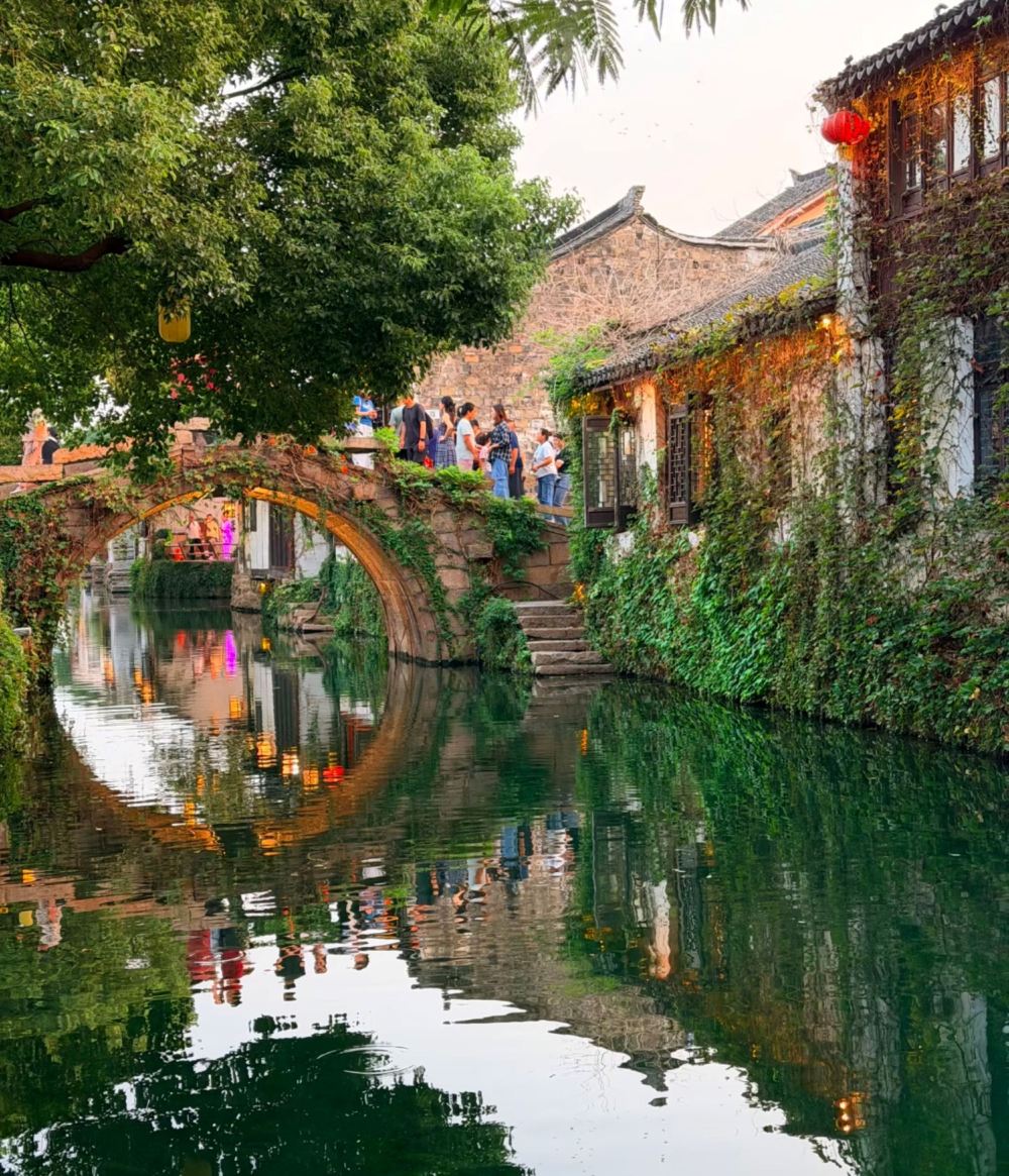 ▲ 石拱桥被藤蔓绿意包裹,桥上游人熙攘,两岸民居爬满青藤,红灯笼与灯光倒映在平静河面,虚实相映。傍晚时分的光影让古镇更具诗意