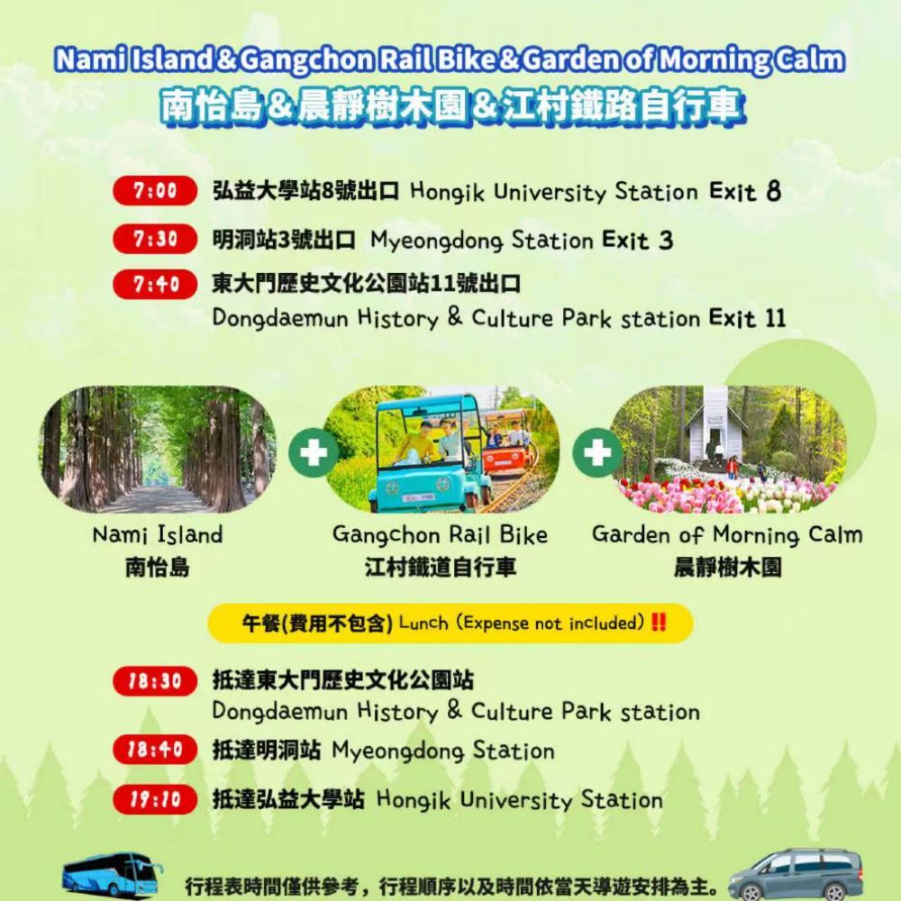 韩国南怡岛+江村铁轨自行车+早晨宁静花园一日游【南怡岛: 韩剧《冬季恋歌》取景地,四季皆美,有银杏大道、骑行小路与湖边美景,浪漫又放松。】