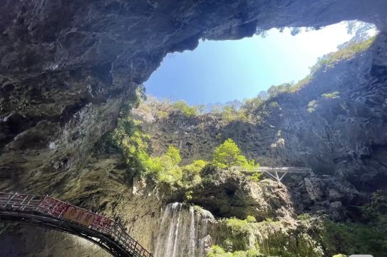 ▲ 午后驱车去英德洞天仙境,这片喀斯特秘境藏着华南第一天坑。核心是坑洞相连的景观,钟乳石形态各异,“观音赐福”“灵龟献寿” 等造型很逼真。可以先坐船游地下河,洞顶天窗洒下阳光,水面会映出光斑,特别梦幻。下船后走悬空玻璃栈道,贴在绝壁上,脚下溪流潺潺,能 360 度看溶洞奇景。
