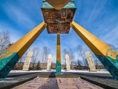 ▲ 【金鸡之冠广场寻北】:广场主题雕塑以“玺”为创作元素,上端是龙形图腾,四面刻有青龙、白虎、朱雀、玄武纹饰。这里是中国纬度最高点的象征,沿路93个书法名家题写的“北”字石碑,指引你走向北极沙洲的最北点雕塑。