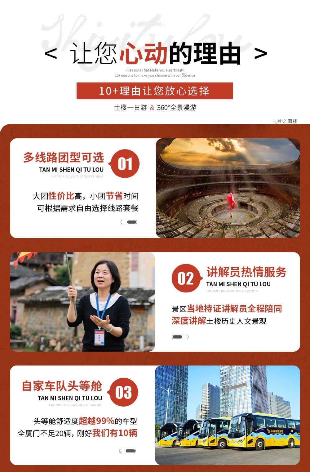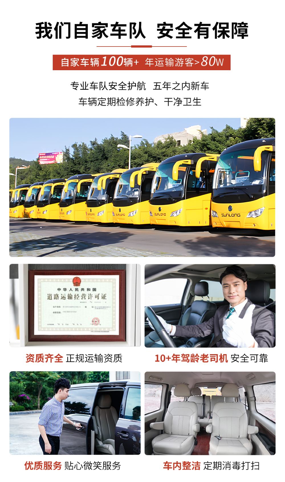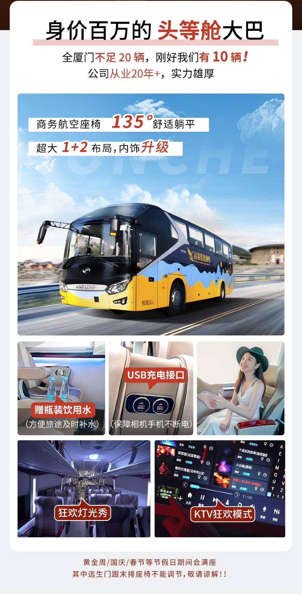 2、本产品按实际人数安排合适车型,并根据先到先上车原则,不预留位置,不接受指定座位,在不影响您行程的情况下,可能会南靖土楼和永定土楼共用车辆,交通过程中需要更换车辆,敬请谅解~