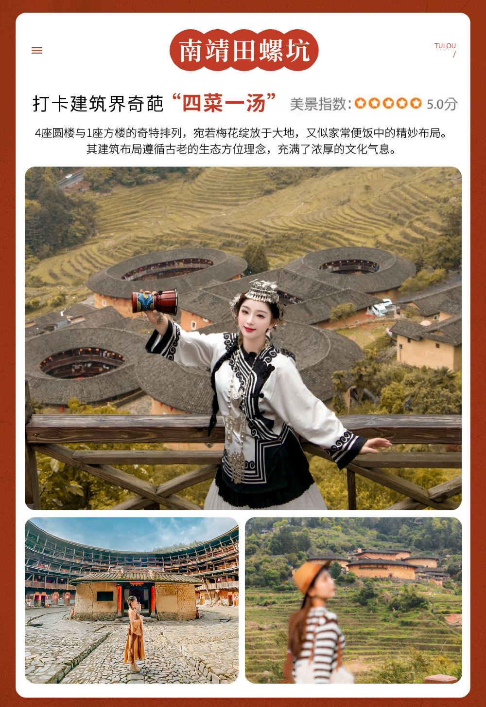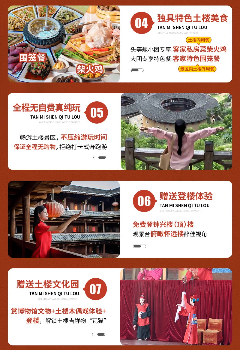 所有土楼线路法定节假日(包括元旦、春节、清明节、劳动节、端午节、中秋节、国庆节)等特殊日期一经预订成功不可退改,由于接待量比较大景区会出现拥堵情况需耐心等待,无费用赔偿。部分出游车上可能会出现没有工作人员,只含当地景区讲解。18人小团人数无上限,可能会出现单双线拼车的情况。