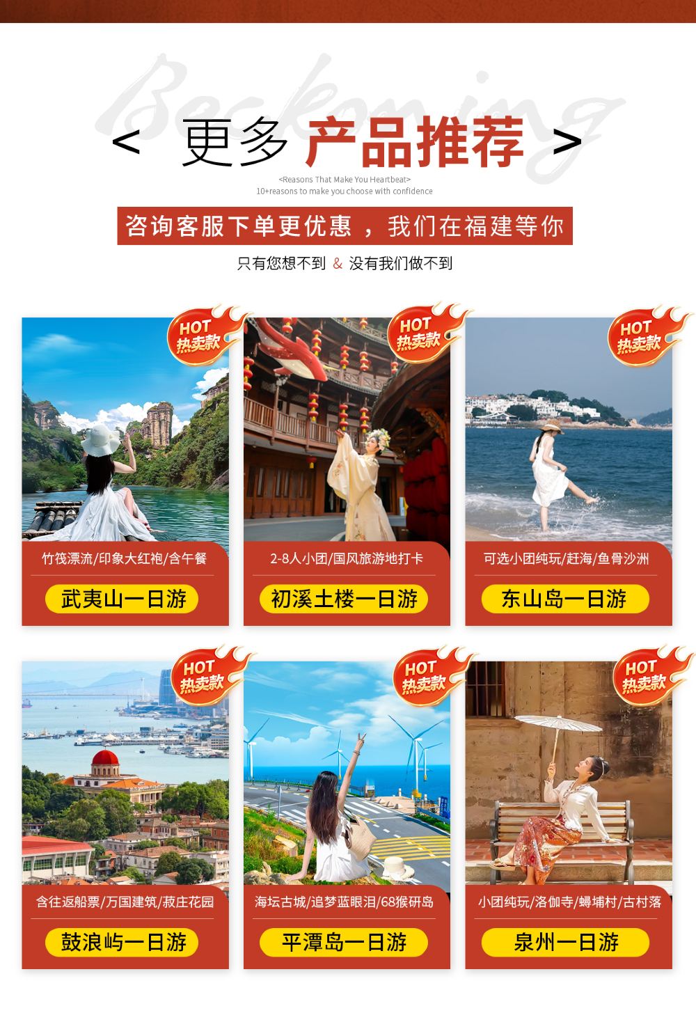 1、本线路页面行程时间及顺序均为大概参考内容,以实际出团情况为准,工作人员提前1天晚上22点前会联系您(请以实际通知为准,保持电话或短信畅通,以免耽误行程) 厦门思明区/湖里区/酒店附近方便停车的地方接站,如鼓浪屿请自行回到轮渡码头,车辆无法停靠的地区请听从工作人员安排至集合点等候。海沧往返接送点:海沧天虹/海沧石塘公交车站、泰地海西公交站。漳州往返接送点:漳州北高速口物流城东公交站。