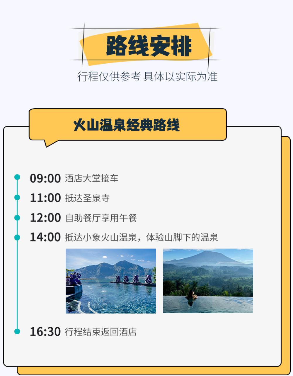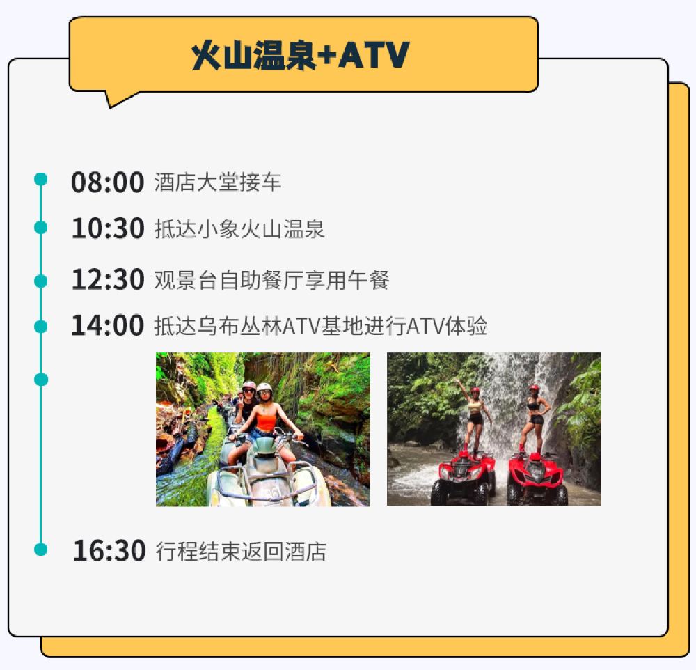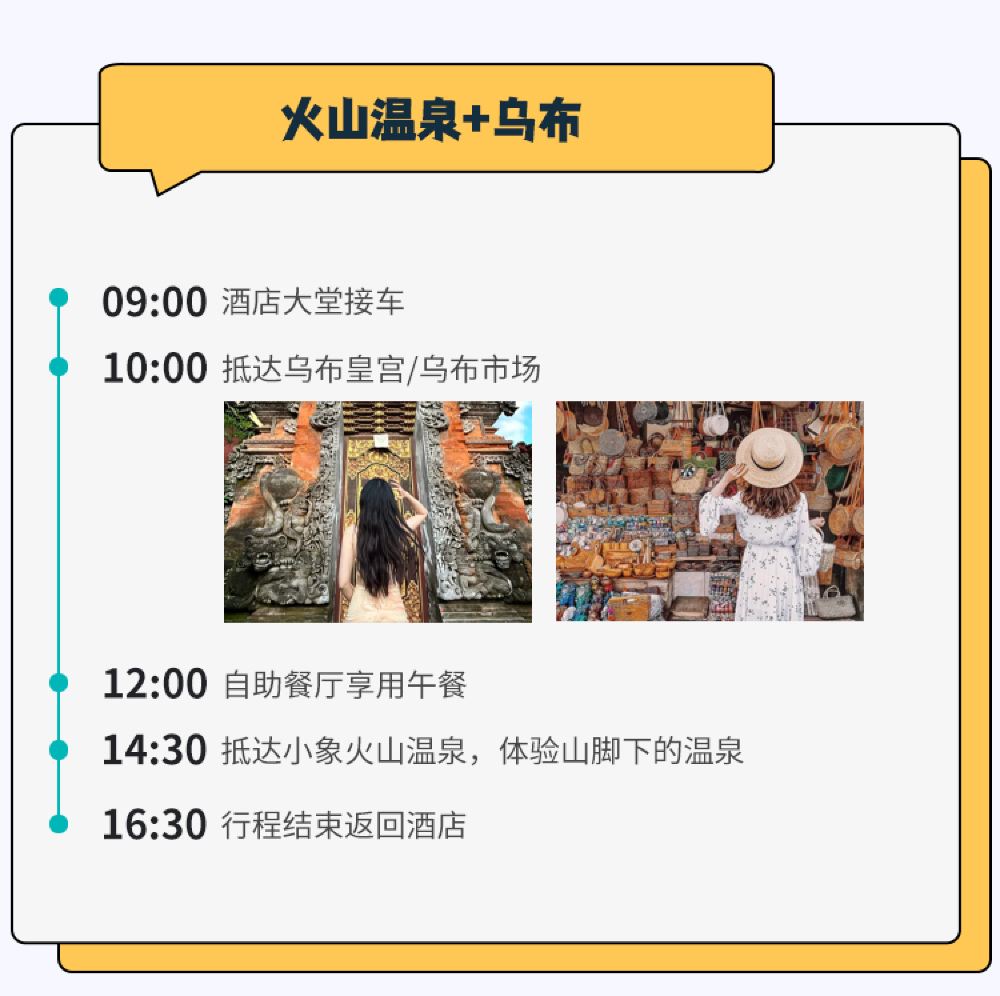 巴厘岛火山温泉一日游【远眺火山可选梯田/圣泉寺/越野ATV】【圣泉寺、乌布皇宫市场、大秋千、梯田、spa多种套餐任意搭配】