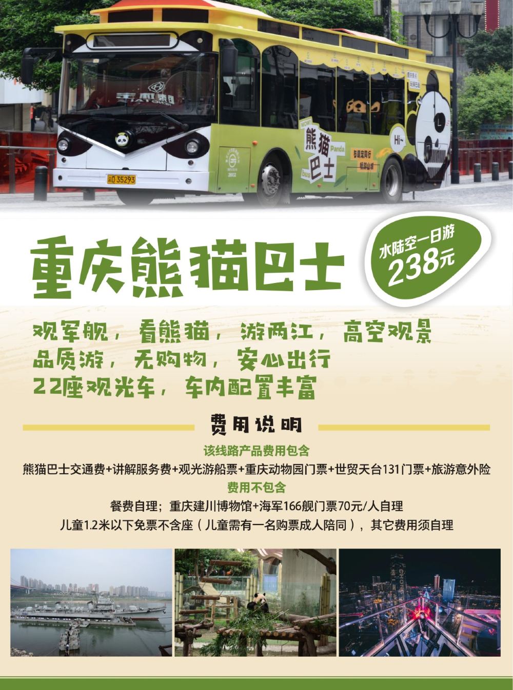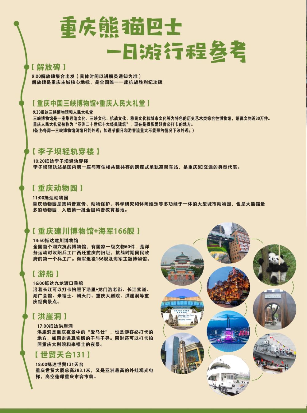行程顺序重庆动物园——建川博物馆(费用需要自理)——166军舰(费用需要自理)——坐船——洪崖洞——人民大礼堂和三峡博物馆——李子坝轻轨穿楼——世贸131
