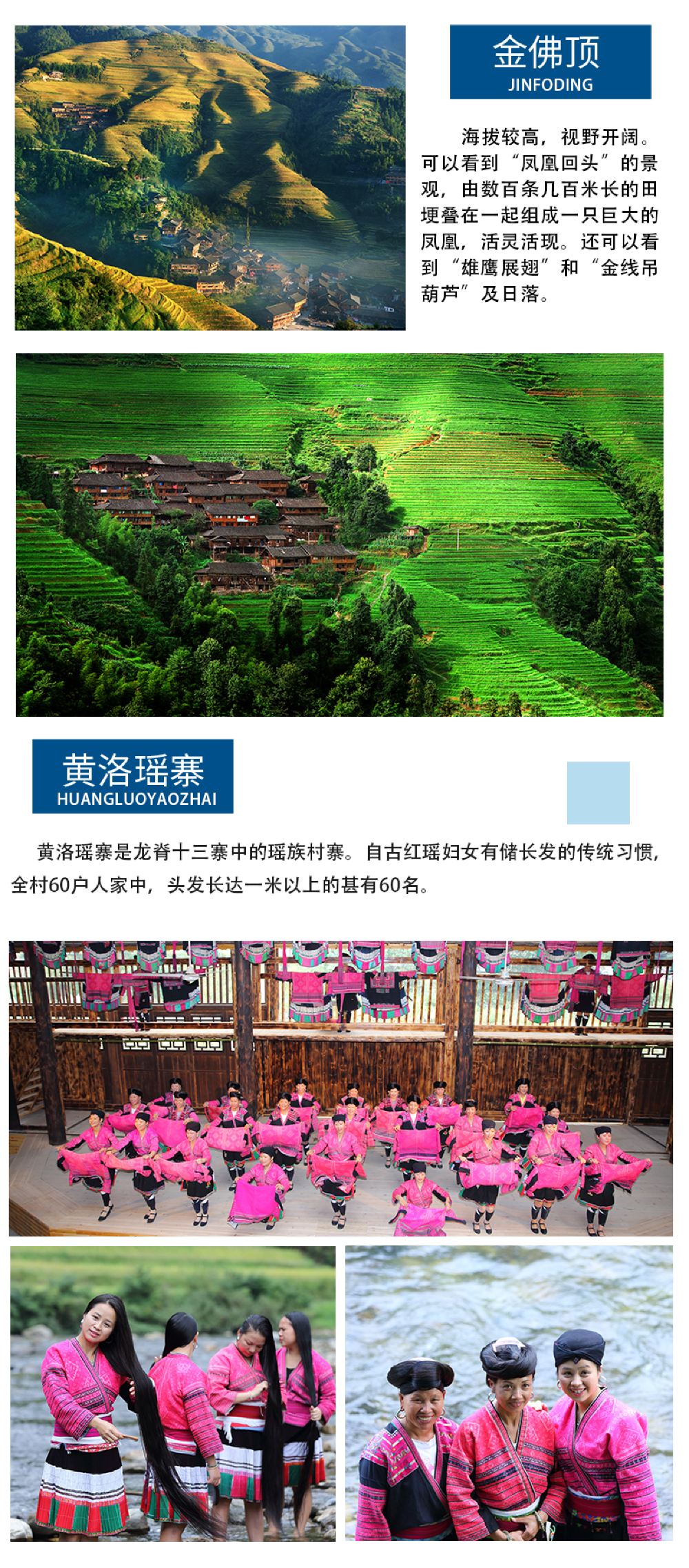 3、节假日期间,因龙脊景区内交通拥堵,景区接待能力有限会有临时封路的情况,有可能会不安排参观黄洛瑶寨长发村敬请谅解;
