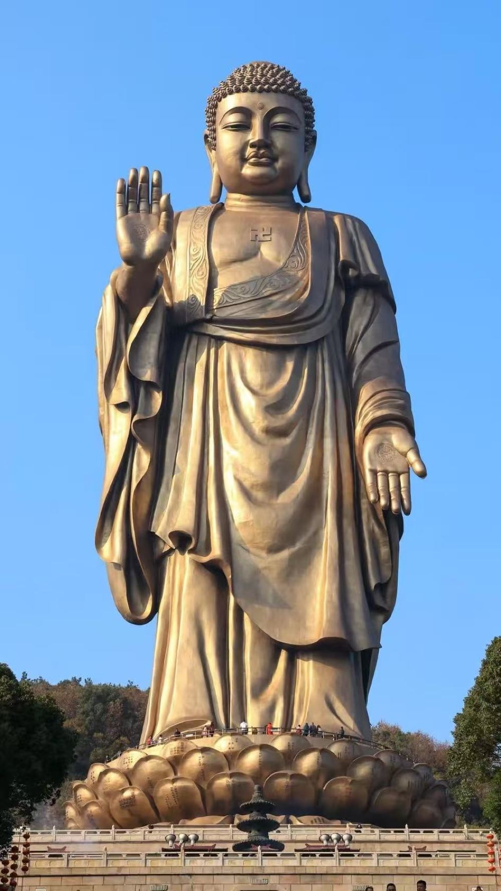 【灵山大佛】在洗心池中洗手平心静气,参观佛脚坛、 菩提大道 和九龙浴 (14:45/16:40 音乐喷泉演出模拟释迦牟尼出生场景),然后在凤凰像洗手,接着瞻仰88米高的铜铸三维灵山大佛,再去和平鸽广场喂鸽子,登上登云大道(218 级台阶,摒弃 108 种烦恼,实现 108 种愿望)后,通过佛教博物馆来到大佛脚下, 欣赏灵山全景。