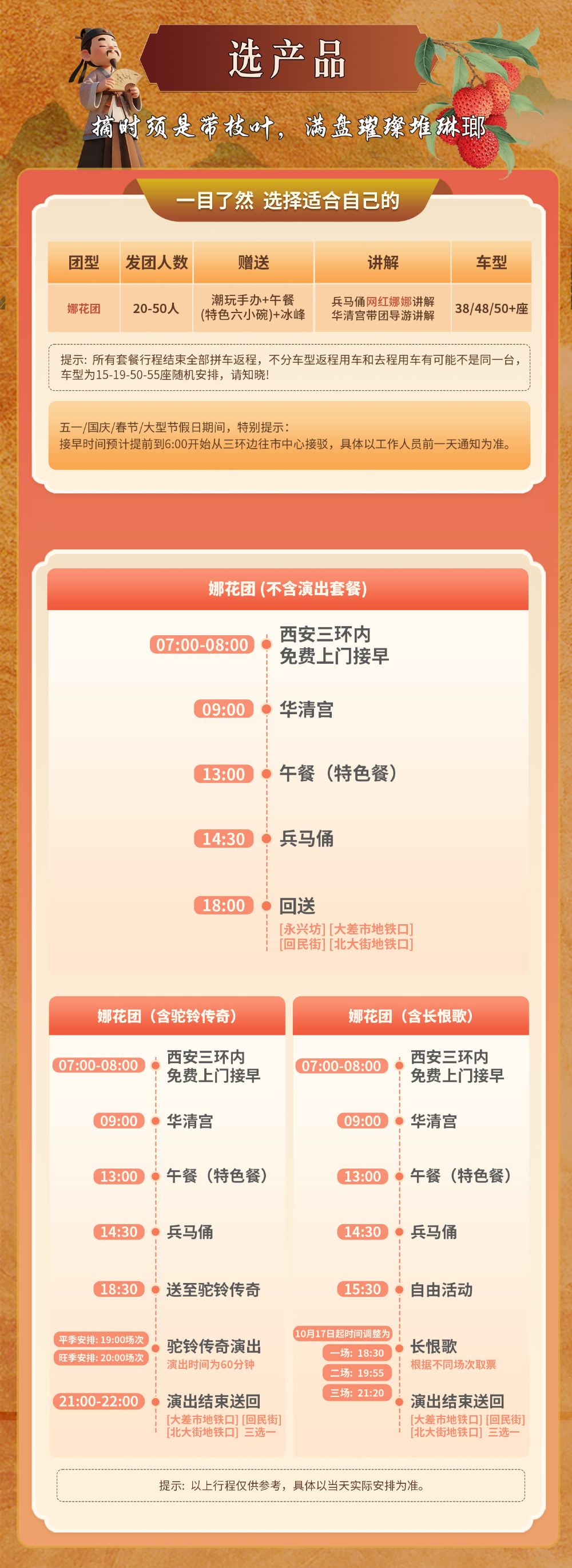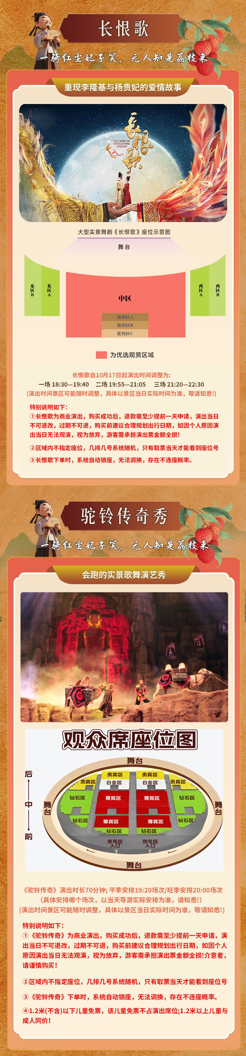 ④2025年自10月17日起,《长恨歌》演出时间:第一场18:30-19:40,第二场19:55-21:05,第三场21:20-22:30,演出时间约1小时10分左右(演出时间景区可能随时调整,具体以景区当日实际时间为准,敬请知悉!)