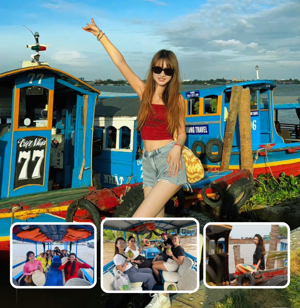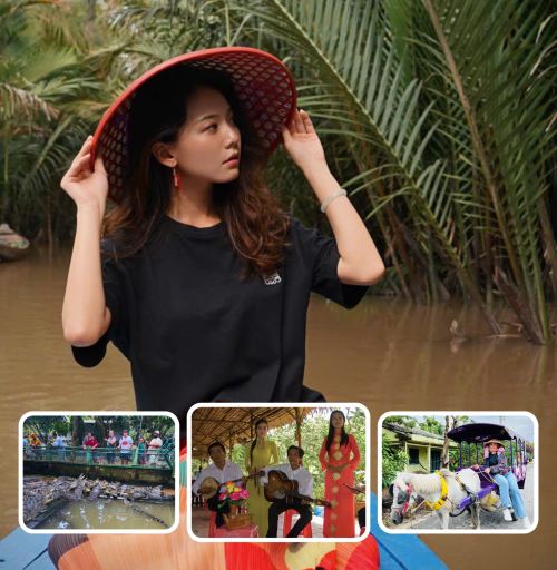 乘坐木船沿天江游览,欣赏龙、兰、贵、凤四个小岛的风景;然后乘坐小舢板穿过狭窄的运河,周围环绕着郁郁葱葱的绿色植物和宁静的大自然