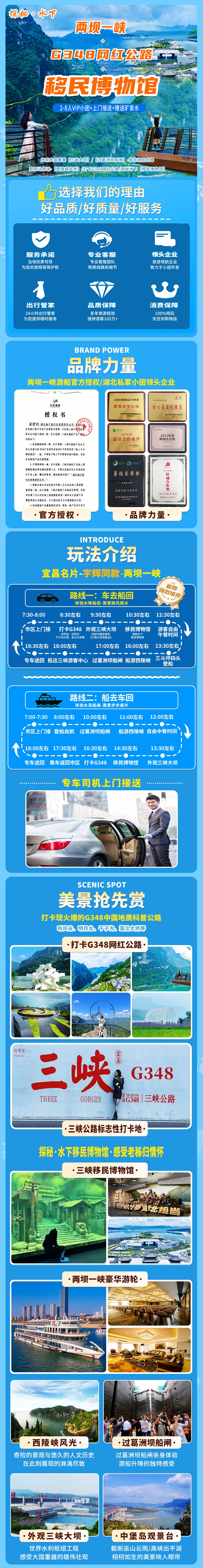 网红专线:为了让游客在一天内游玩三峡特色景点,我们特制定了此线路,既能游览宜昌标志性行程-【两坝一峡】,还能打卡现火爆【G348网红公路】,了解【三峡移民博物馆】感受秭归的历史文化,看水下博物馆。